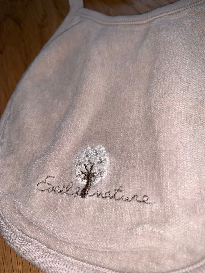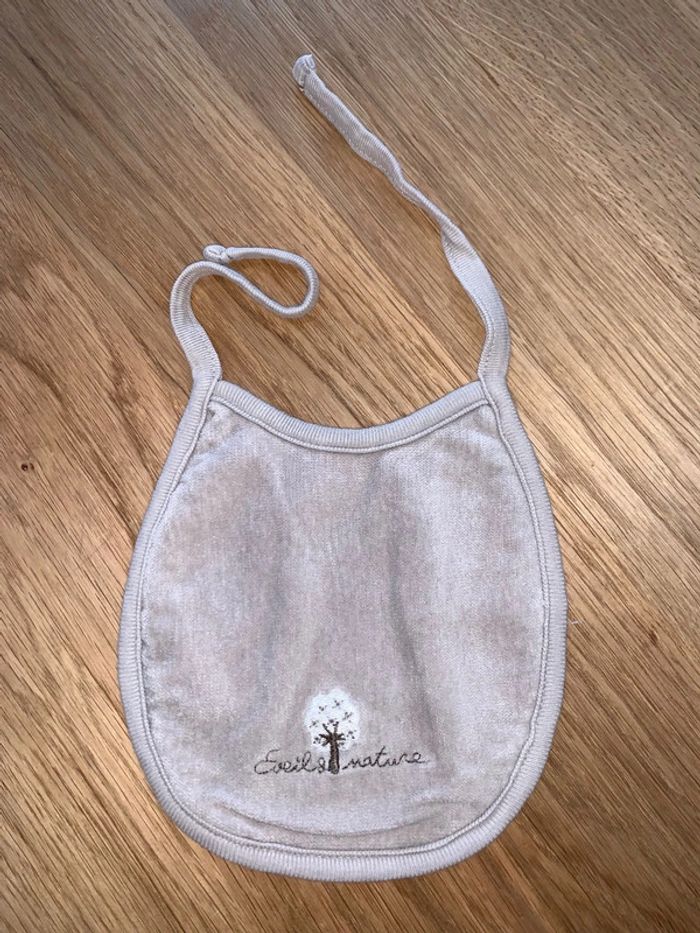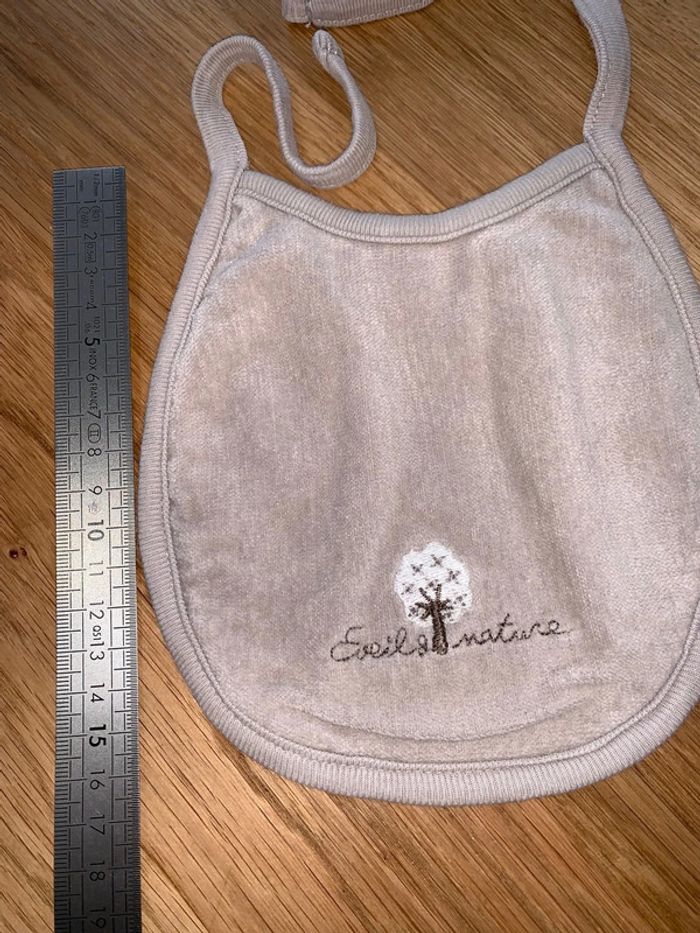 Bavoir bébé Tao tape à l’œil Marron Visuel marron brodé : éveil nature + arbre Tissu doux devant Éponge à l’arrière Fermeture liens noeud Cf photos pour dimensions
