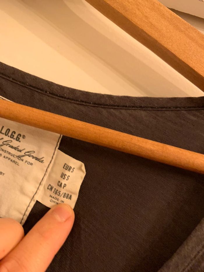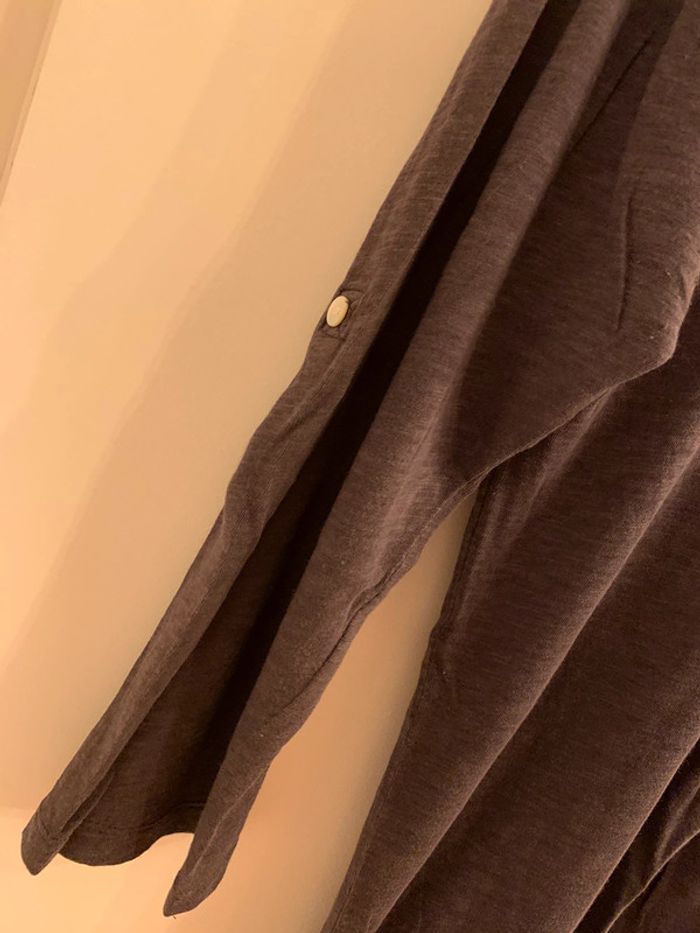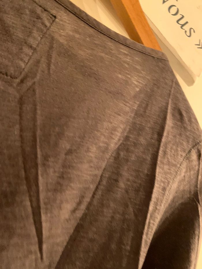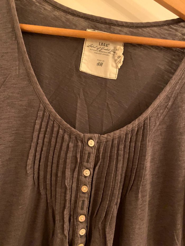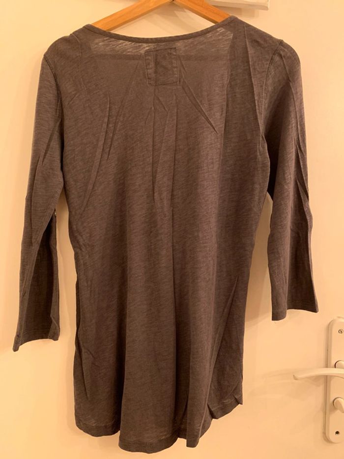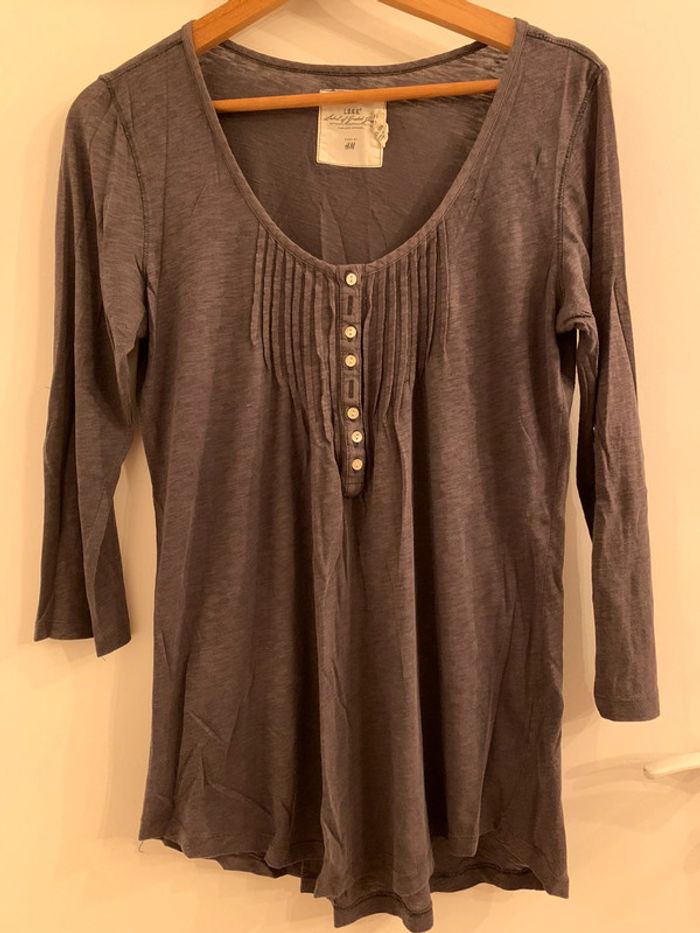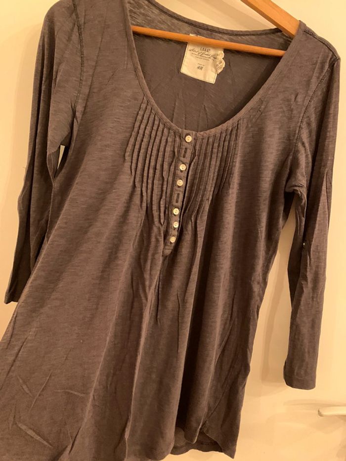 Tee-shirt femme H&M Tisssu gris souple avec élastane Coupe droite Bas droit Encolure arrondie avec plis Manches 3/4 avec boutons pour retrousser Encolure arrondie avec plis piqués Ouverture milieu devant avec boutons