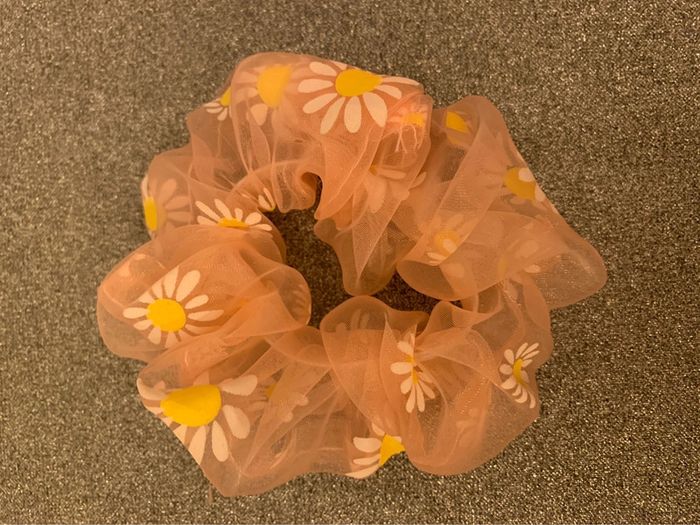Chouchou Adopt’ Tissu tulle transparent rose avec fleurs marguerites jaunes et blanches Accessoire coiffure cheveux