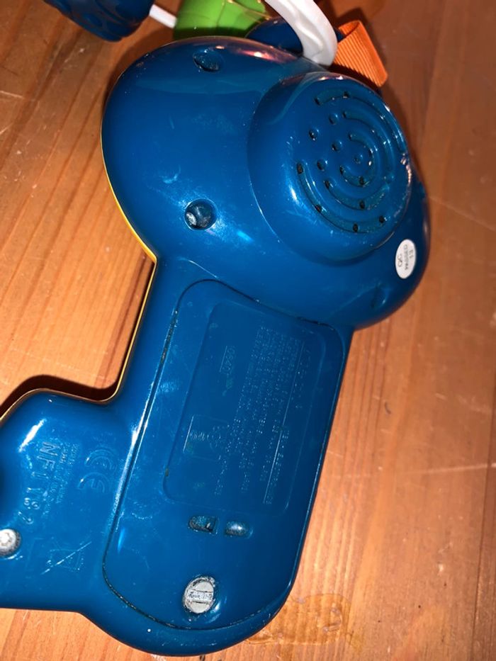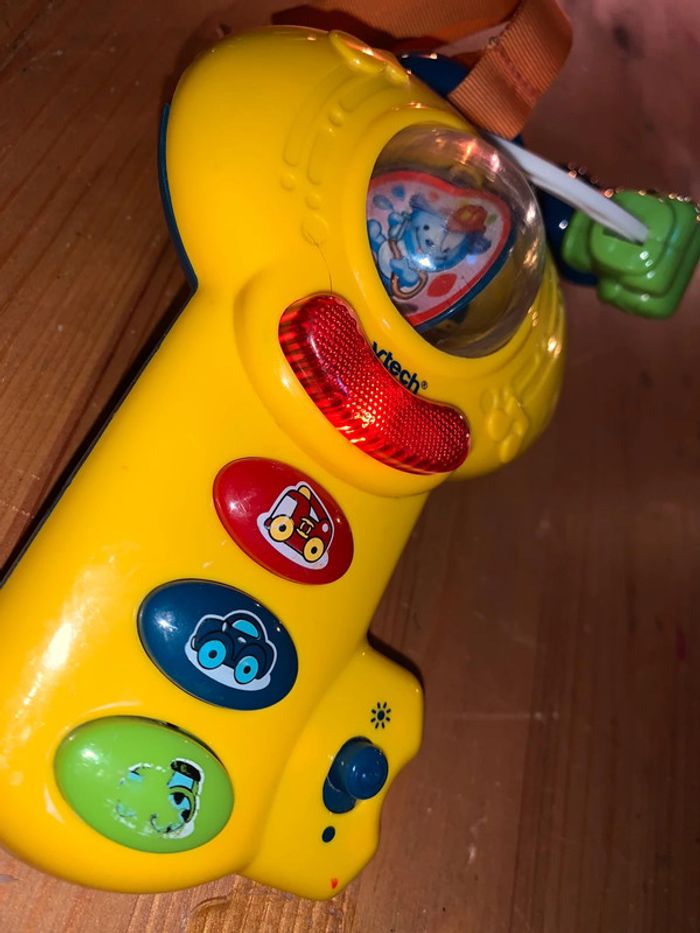 Jouet enfant clé magique Vtech Ludique sonore et lumineux Anneau dans le haut avec objets qui se déplacent Boule au centre tourne avec plusieurs visuels Boutons pour émettre différents sons bruits Quelques petites rayures et dessins légèrement effacé idem photos Boucle ruban d’attache Blanc rouge jaune vert bleu blanc orange