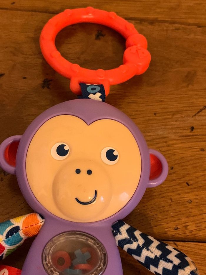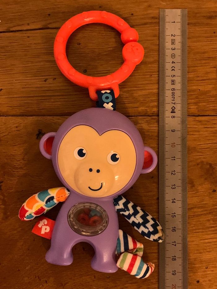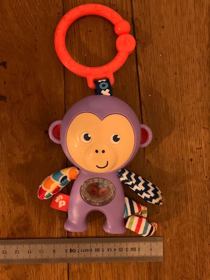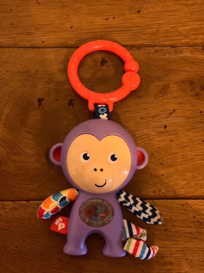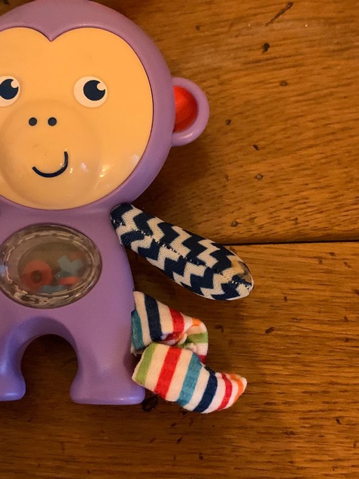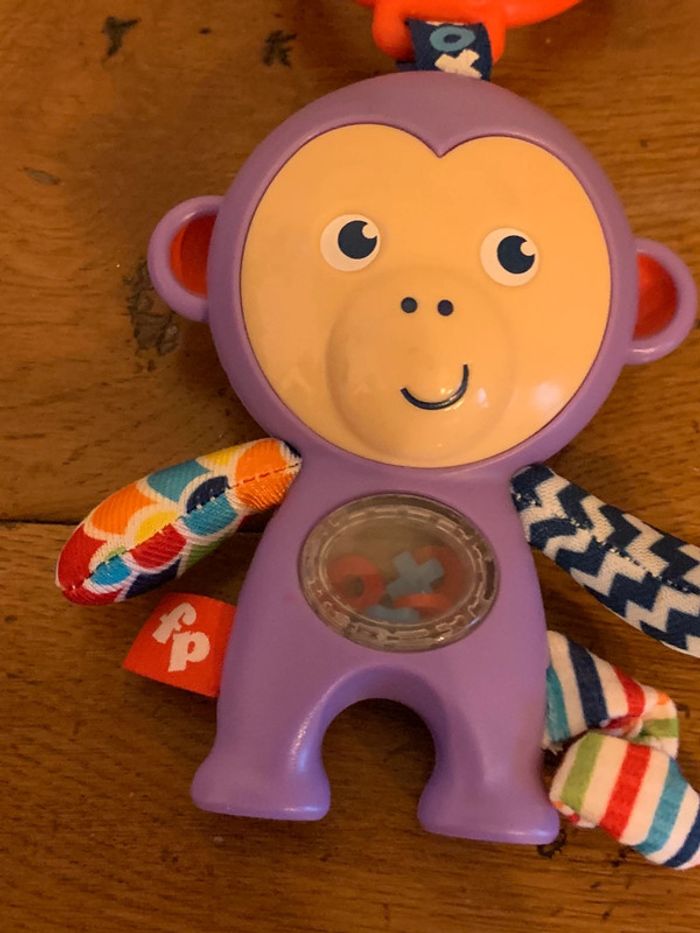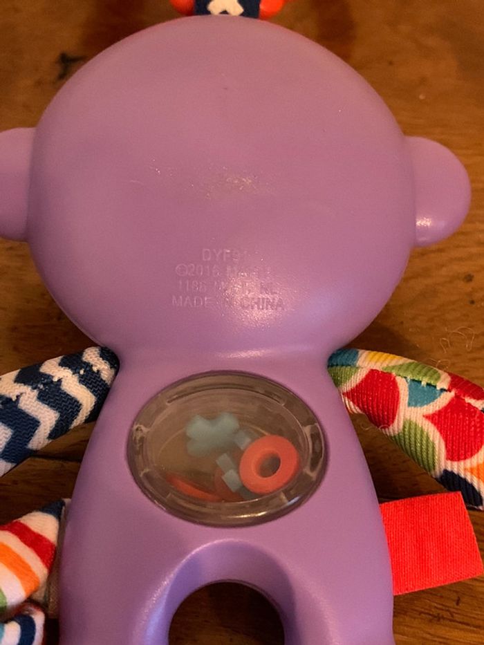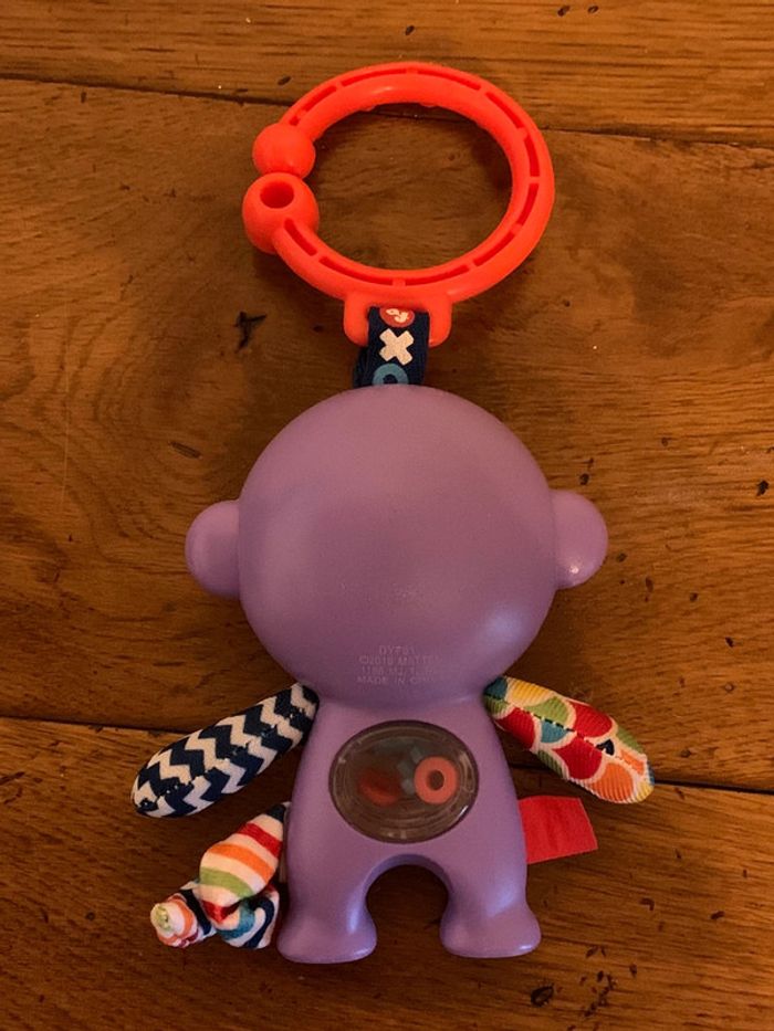 hochet jouet enfant Fisher Price singe ludique violet boucle d’attache rouge petites pièces x-o colorées dans le ventre transparent = petits bruits attrayants pour bébé patte, queue et bras en tissus multicolores