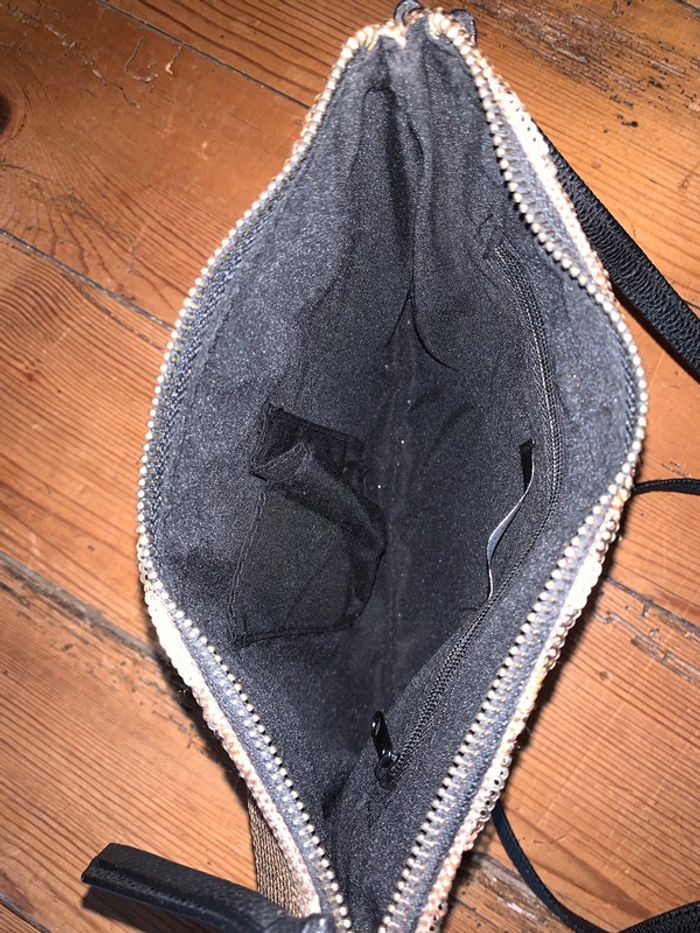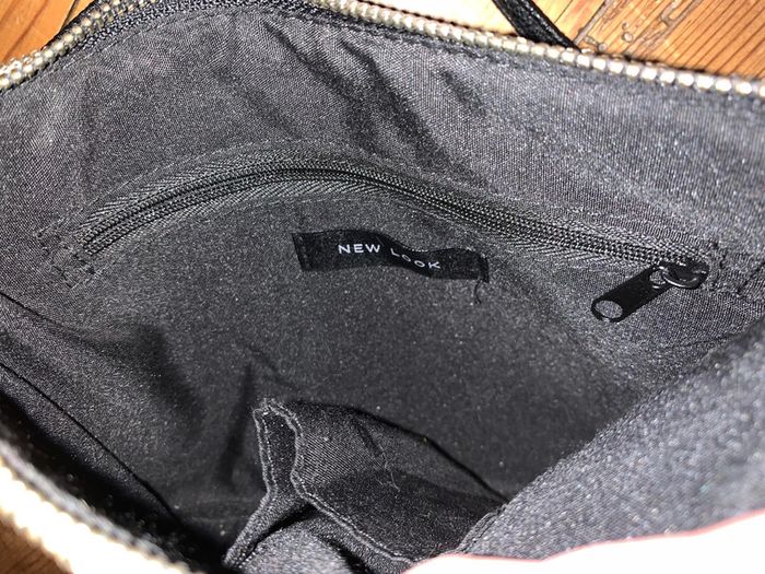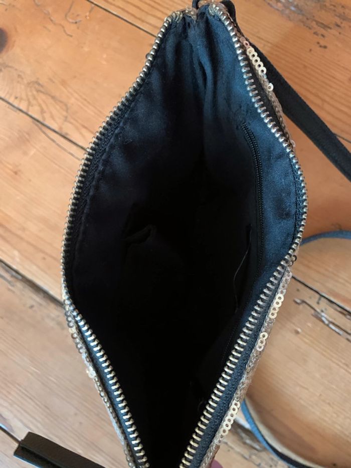 sac à bandoulière réglable femme New Look peut servir de sac et ou pochette anse en simili cuir ouverture fermeture par zip doré + pompon lanière extérieur sequins or doré intérieur doublé coton noir uni + pochette de rangement coloris noir 25 x 18 cm