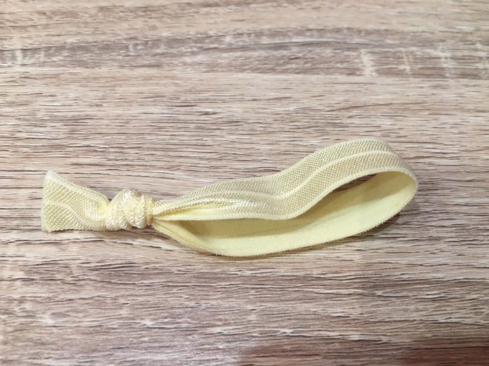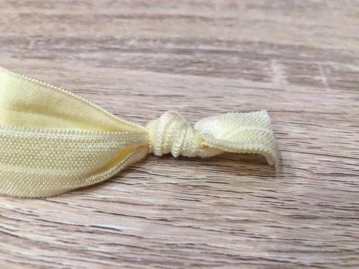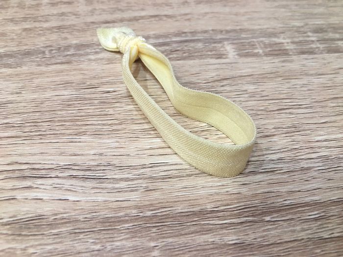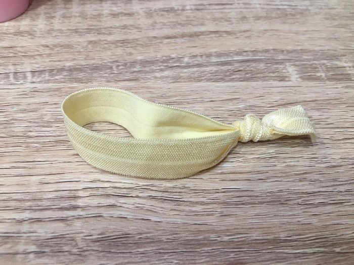 bracelet élastique Parfois tissu jaune clair plat sur le poignet noué : permet de régler suivant taille du poignet peut être utilisé en bracelet ou élastique chouchou cheveux