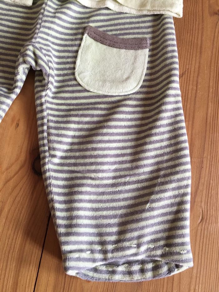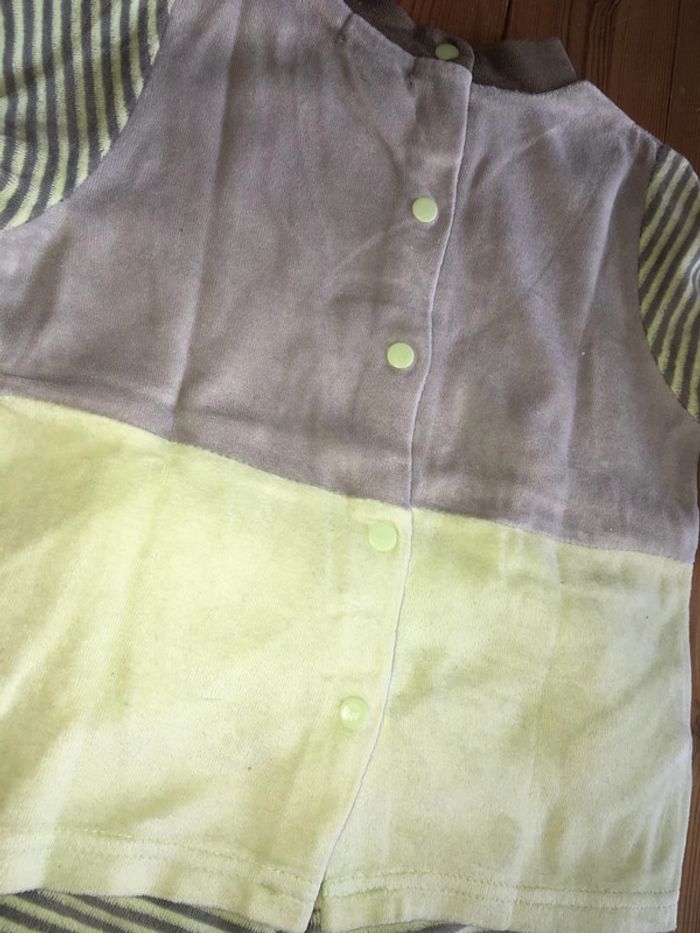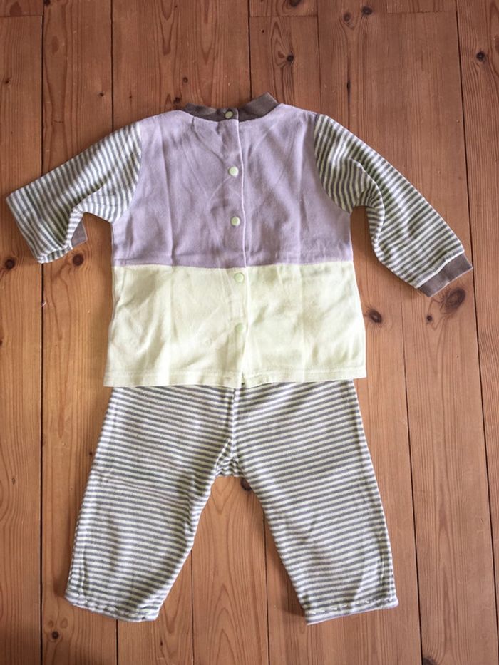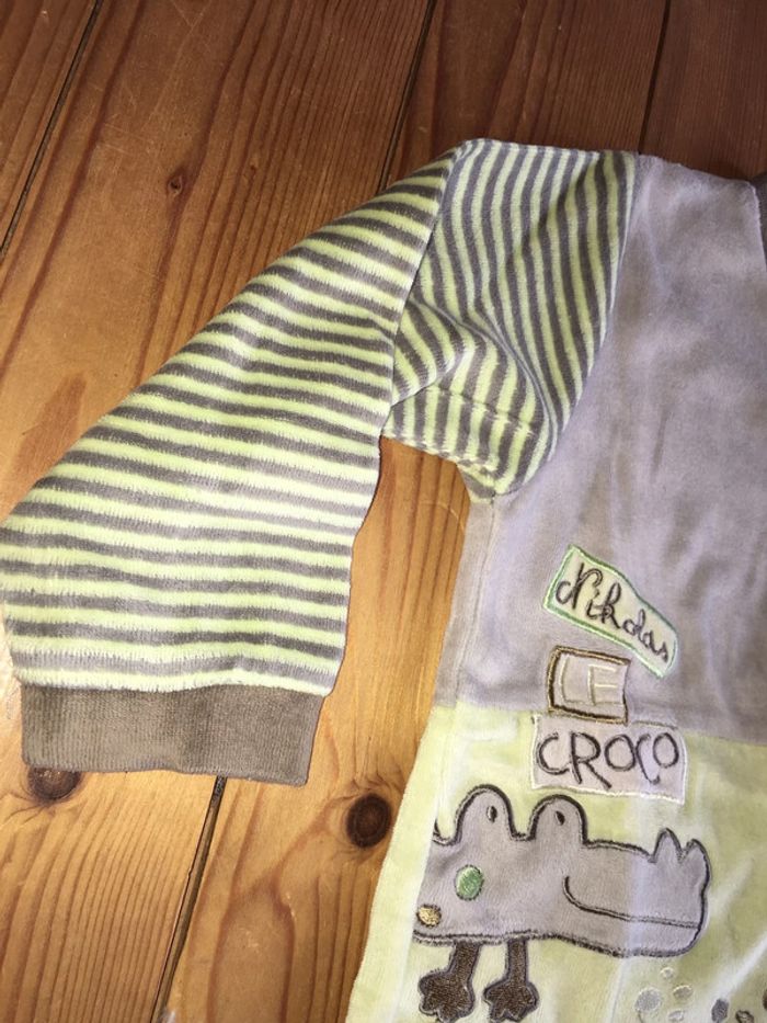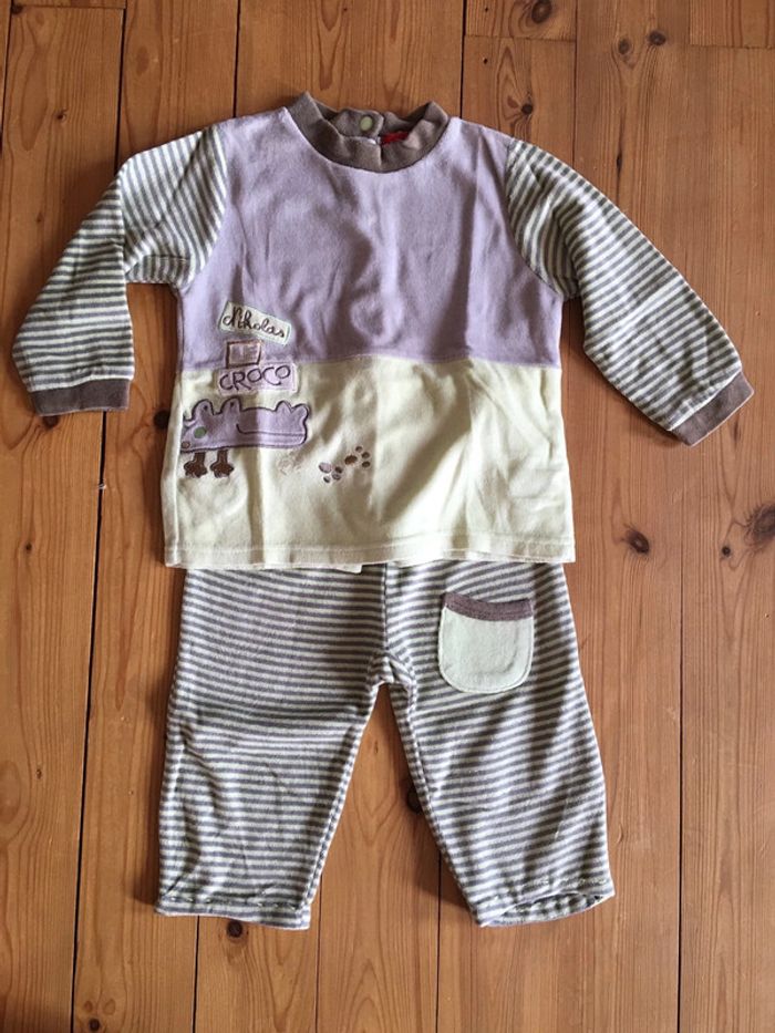 pyjama 2 pièces long Tissaia dors bien encolure arrondie, finition biais manches longues jambes longues coupe droite haut et bas peuvent être accrochés ensemble grâce à des boutons pressions de chaque côté (idéal pour que le bas de pyjama ne tombe bas lorsque bébé bouge) tee-shirt: ouverture fermeture dos par boutons pressions manches à rayures corps avec découpe horizontale: deux couleurs: haut gris-marron, bas vert visuel crocodile pantalon: rayé pieds ouverts poche devant ceinture élastiquée chaud, idéal pour dormir coloris gris-marron, vert taille 12 mois