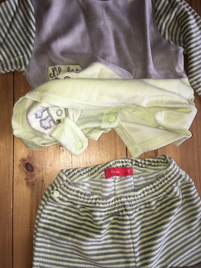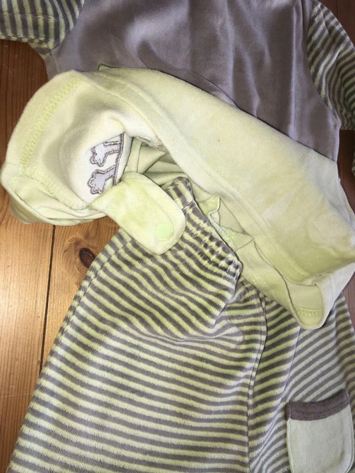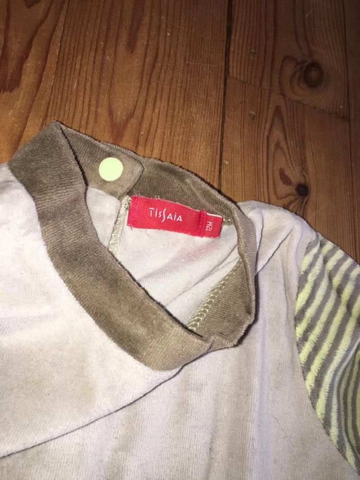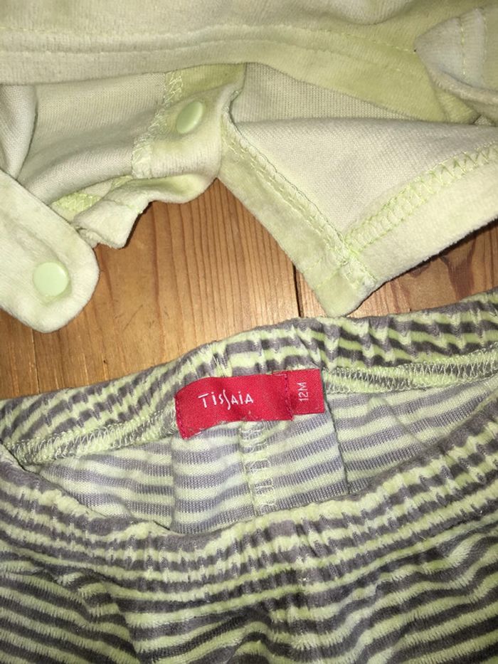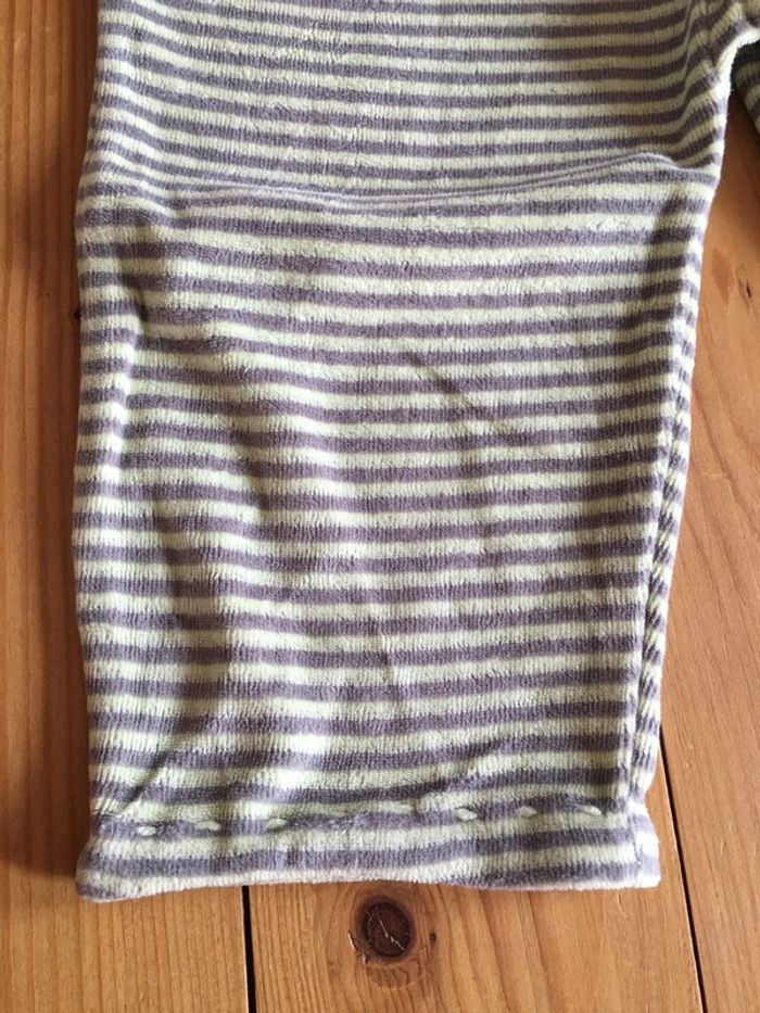 pyjama 2 pièces long Tissaia dors bien encolure arrondie, finition biais manches longues jambes longues coupe droite haut et bas peuvent être accrochés ensemble grâce à des boutons pressions de chaque côté (idéal pour que le bas de pyjama ne tombe bas lorsque bébé bouge) tee-shirt: ouverture fermeture dos par boutons pressions manches à rayures corps avec découpe horizontale: deux couleurs: haut gris-marron, bas vert visuel crocodile pantalon: rayé pieds ouverts poche devant ceinture élastiquée chaud, idéal pour dormir coloris gris-marron, vert taille 12 mois