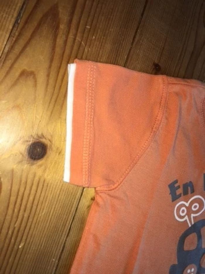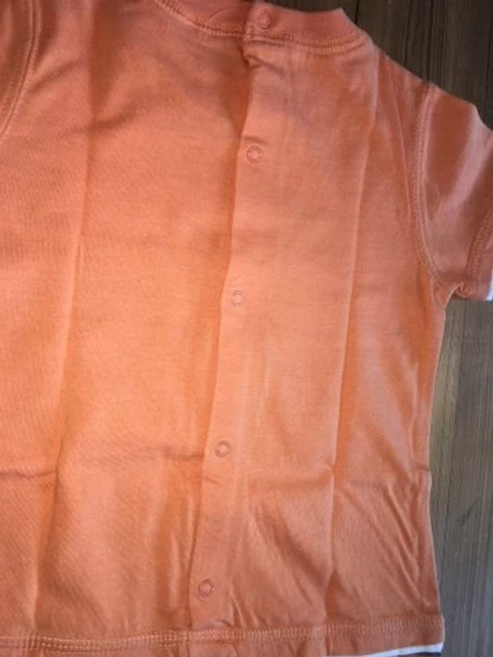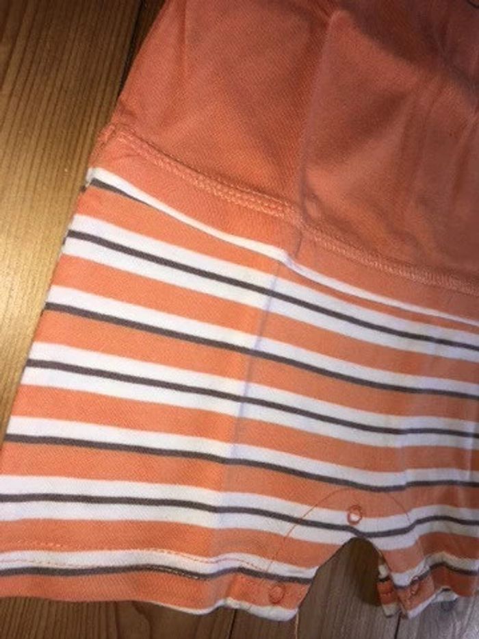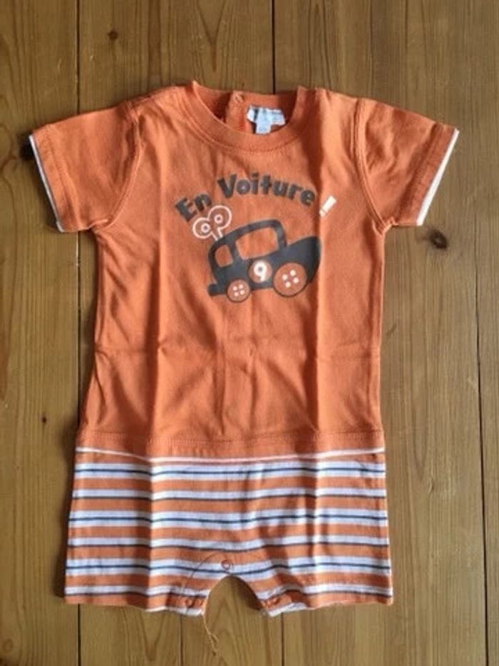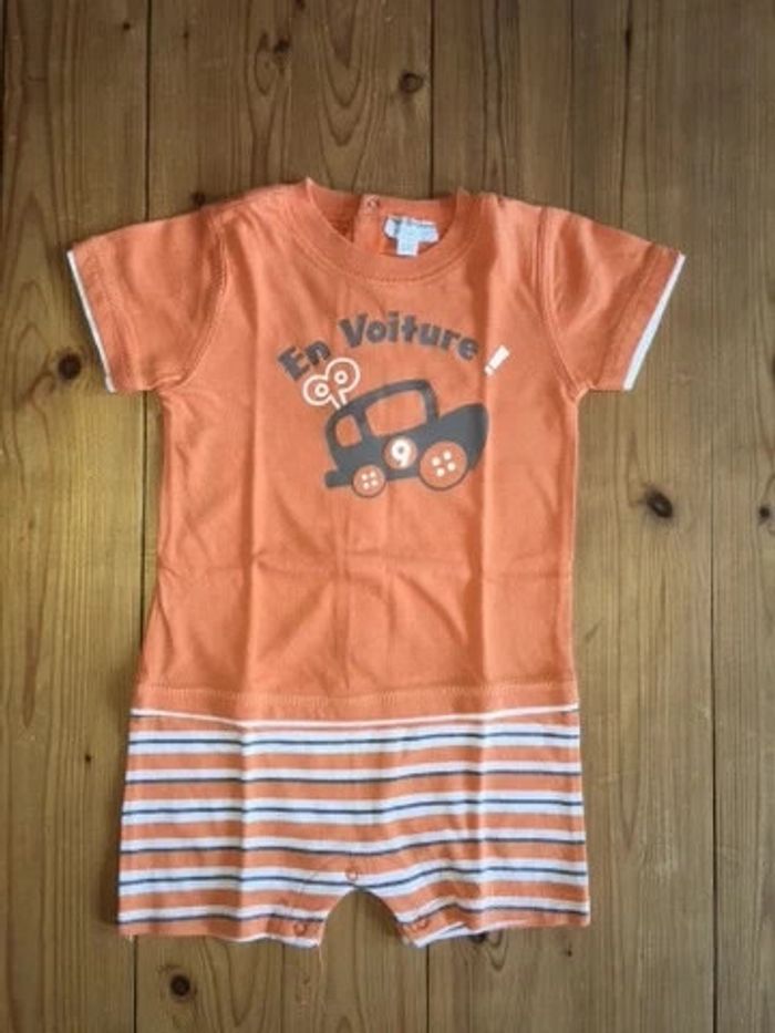 pyjama 1 pièce long Kimbaloo dors bien combinaison encolure arrondie, finition rib manches courtes, effet doubles manches avec petits débordé blanc taille 12 mois porté une seule fois jambes courtes / short effet deux en un: haut orange uni avec visuel sérigraphie print voiture en route + bas rayé à rayures orange gris blanc ouverture fermeture dos par boutons pressions coloris gris blanc orange