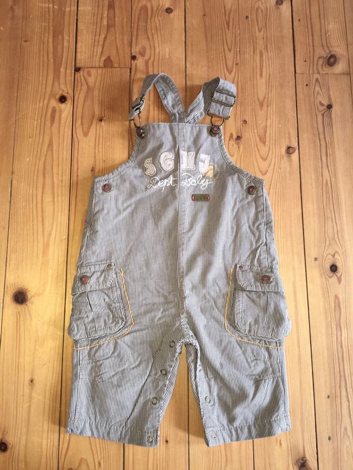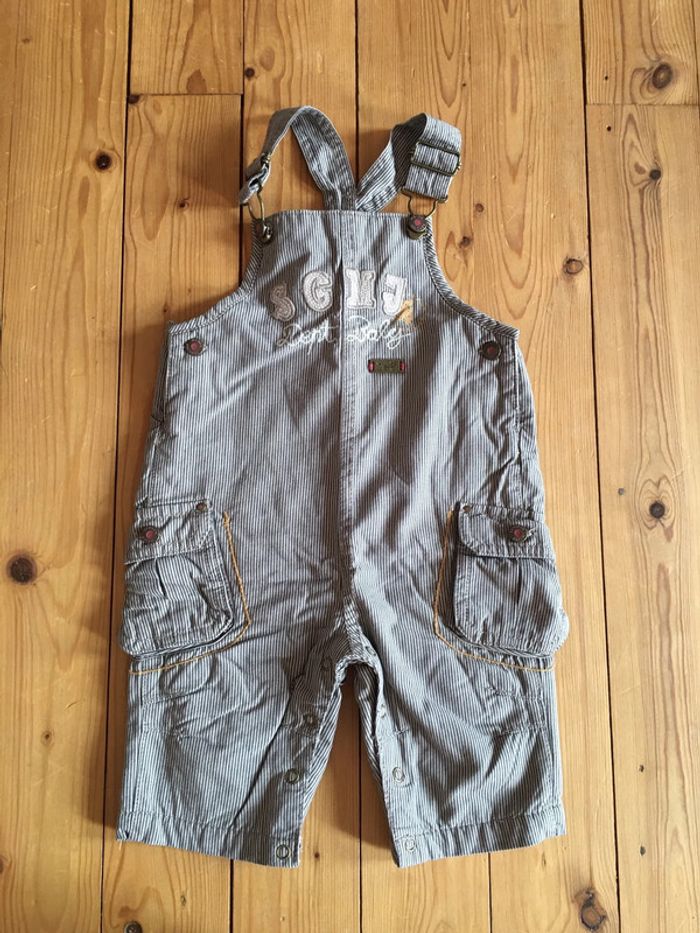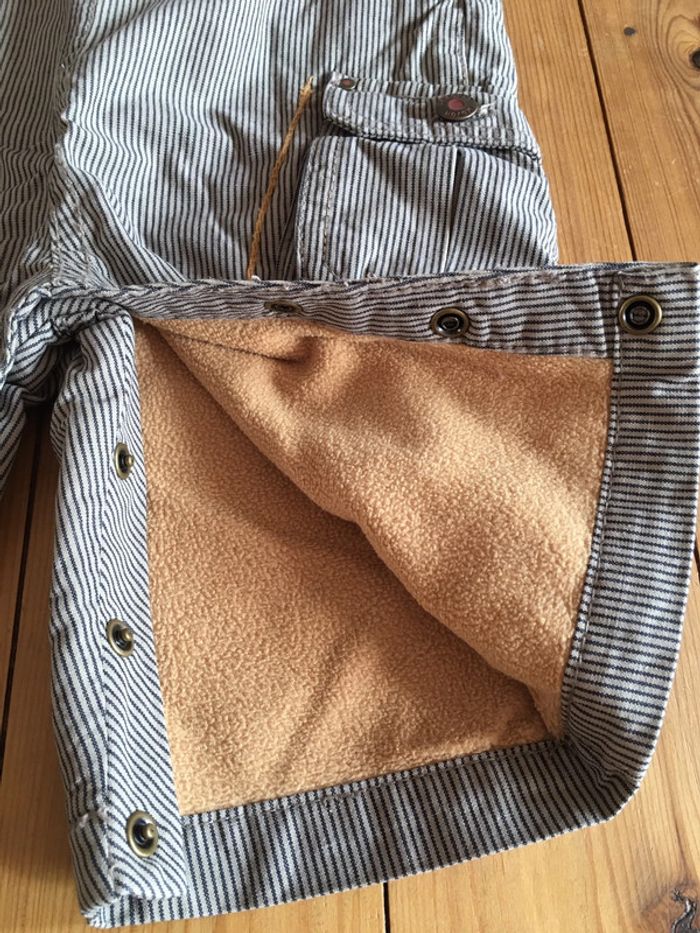 salopette enfant garçon Sergent Major tissu à rayures marron et beige jambes longues entrejambe avec boutons pressions poches à soufflets sur côtés fentes + boutons sur côtés bavette avec broderie + application + print sérigraphie bretelles réglables avec attaches + boutons clous coupe droite intérieur doublé tissu polaire marron camel portée 1 fois