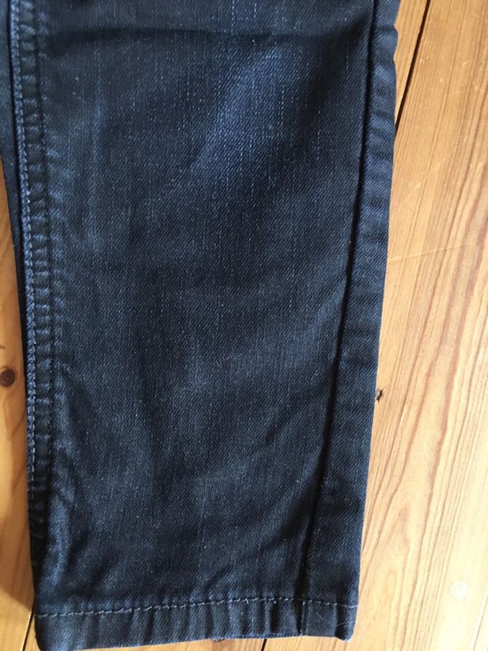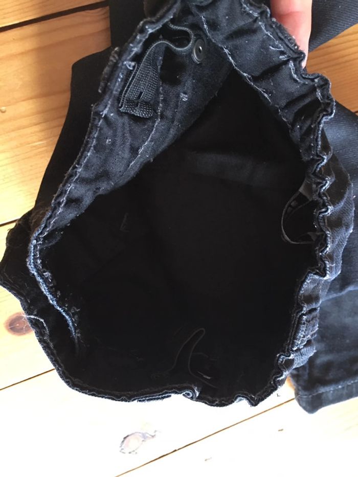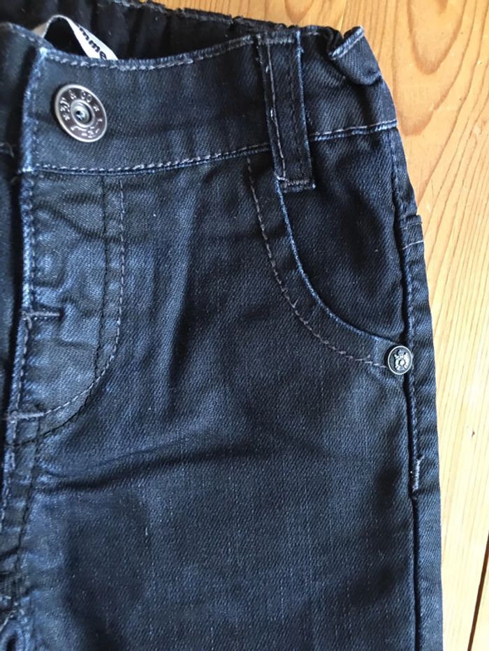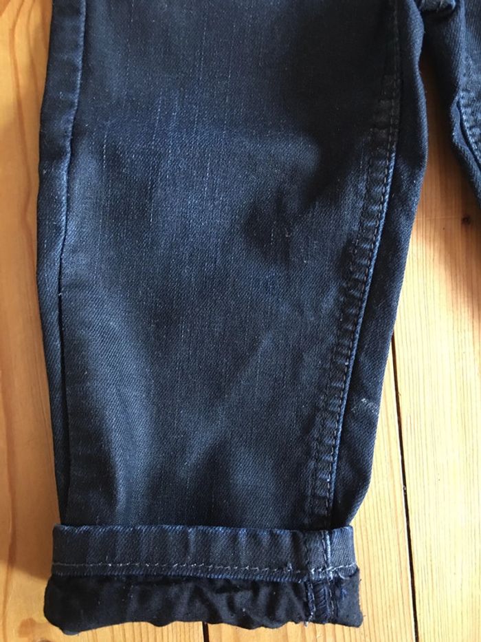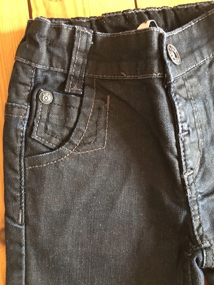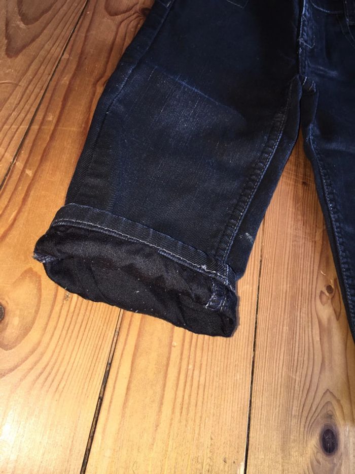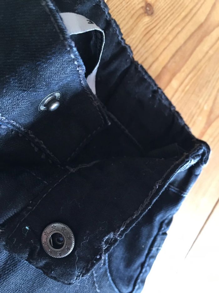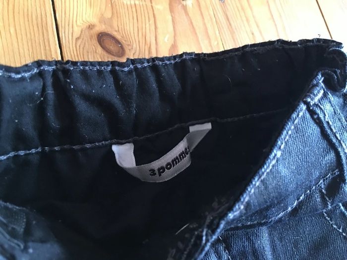 pantalon enfant garçon 3 pommes coloris bleu Marine effet huilé jambes longues coupe légèrement ajustée slim intérieur doublé (tissu bouloché, mais part avec un rasseoir à laine tissu) porté 1 fois ceinture élastiquée réglable à l’intérieur bouton pression devant devant et dos rivets déco surpiqûres Bleu Marine