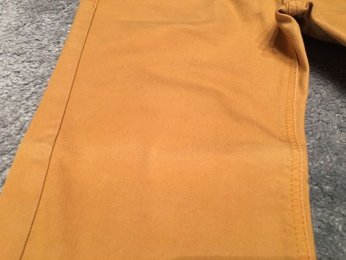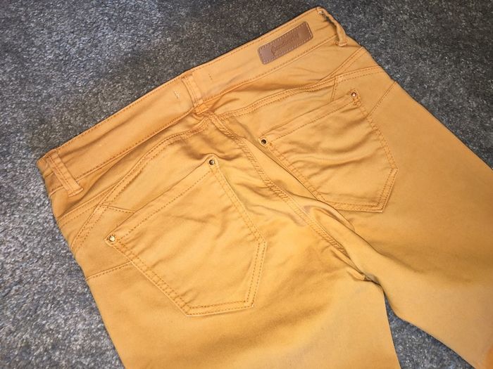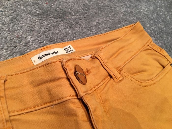 pantalon femme Stradivarius coupe skinny jambes longues poches devant et dos légèrement blanchi devant cf photo (ne se voit pas au porté) coloris jaune moutarde tissu souple avec elasthane réhausse surpiquée au dos + étiquette déco fermeture par zip + bouton clou porté deux fois