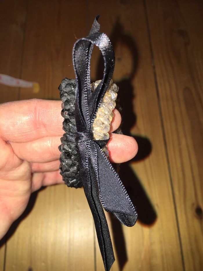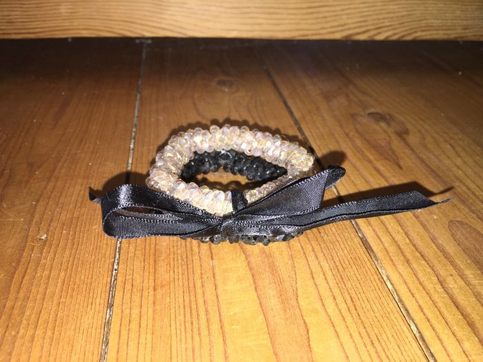 lot deux chouchous bijoux Adopt’ perles à facettes noir + beige reliés ensemble grâce à un noeud de ruban noir pour coiffure accessoire pour attacher, agrémenter cheveux peut également être utilisé en bracelet
