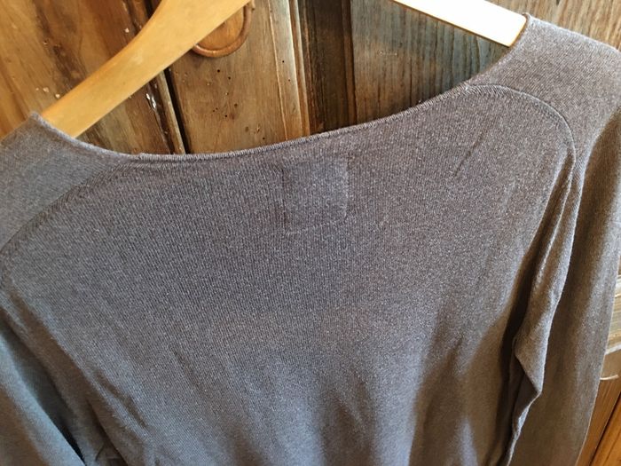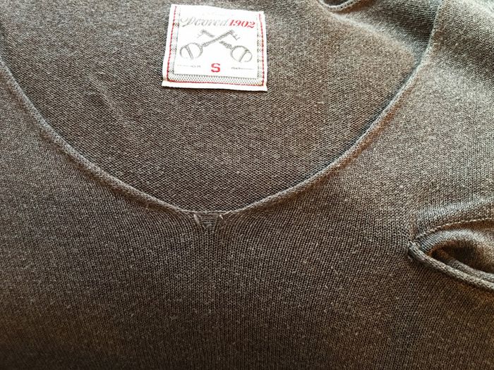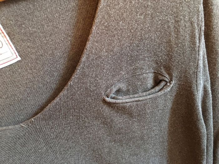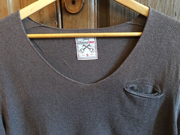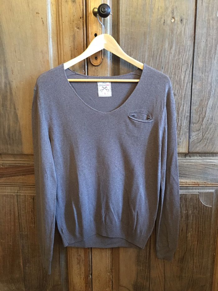 pull homme Devred manches longues coupe droite bas droit finition bord rib encolure en v roulotée (voire photo pour la pointe de l’encolure) légèrement bouloché idem photo poche poitrine souple