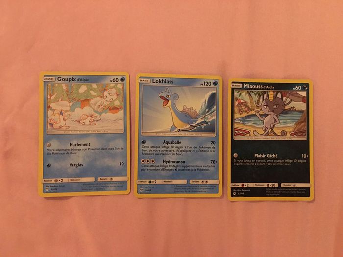 lot 3 cartes Pokémon françaises à collectionner coloris bleu Goupix Lokhlass coloris vert foncé Miaouss