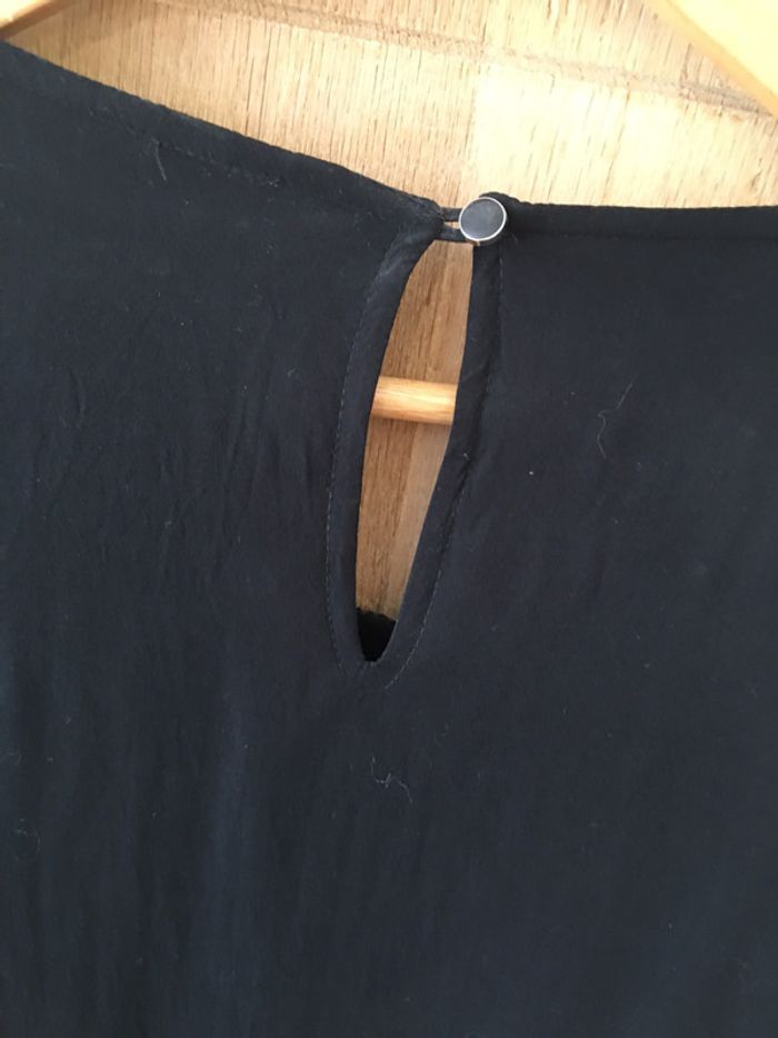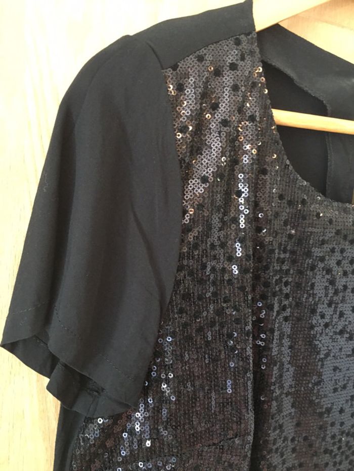 tee shirt / t-shirt chic femme Mango coloris gris noir tissu souple sequins noir devant uni au dos coupe droite bas droit fentes sur cotés manches courtes encolure arrondie ouverture goutte d’eau au dos + bouton bijoux très agréable à porter porté 1 seul fois