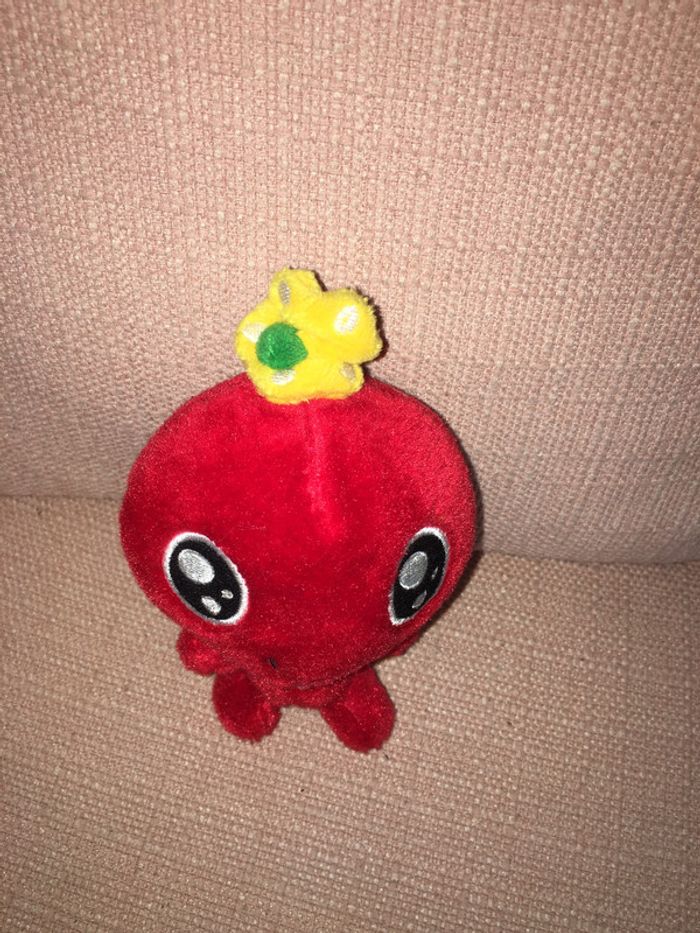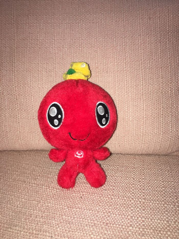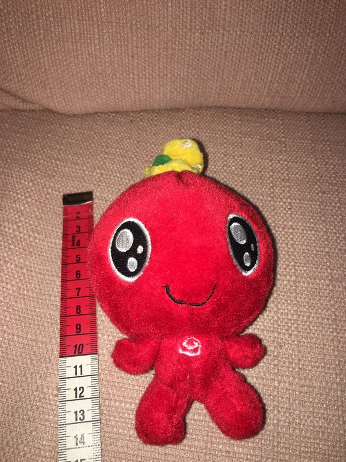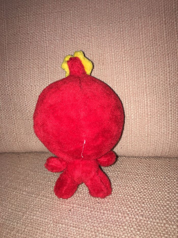 peluche doudou petit bonhomme rigolo formes enfantines bras et jambes souples intérieur rembourré tissus doux rouge couronne jaune et verte sur le dessus de tête yeux noirs hauteur 14 cm