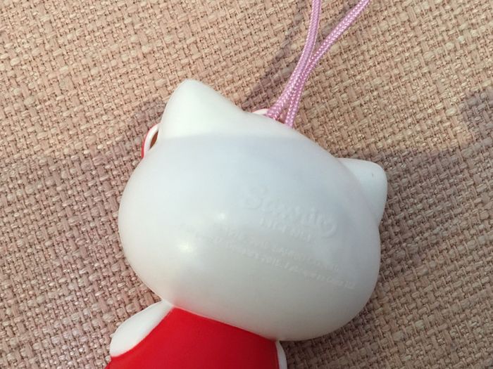 personnage figurine à collectionner Hello Kitty - petit chat gourmand avec gâteau cup cake dans les mains Sanrio jouet à collectionner Mc Donald’s happy meal coloris blanc rouge rose marron attache pour porté clé idéal pour rejouer les scènes des dessins animés