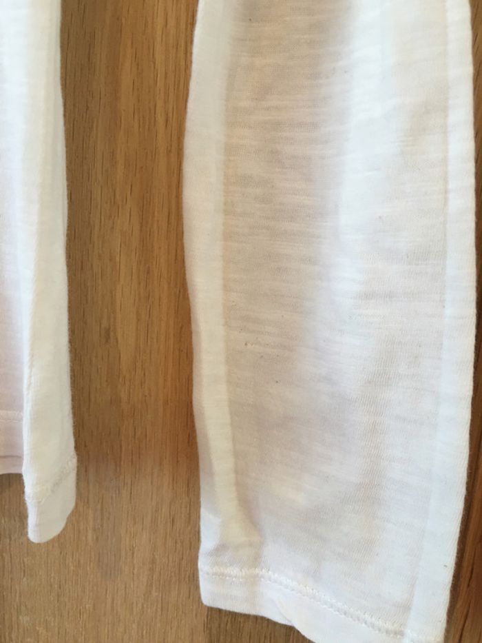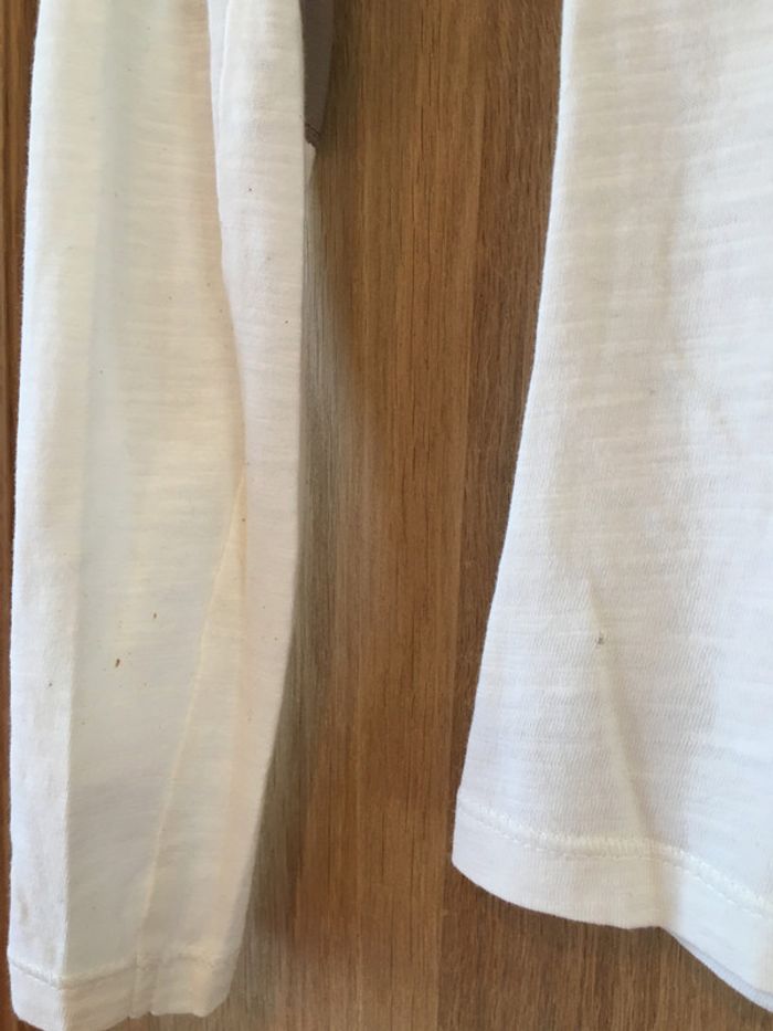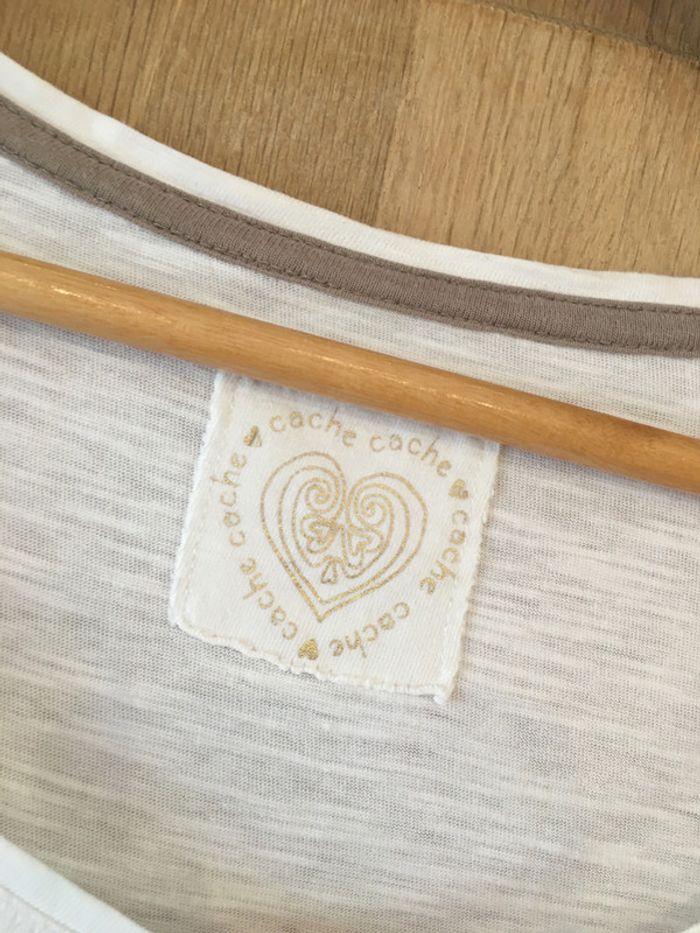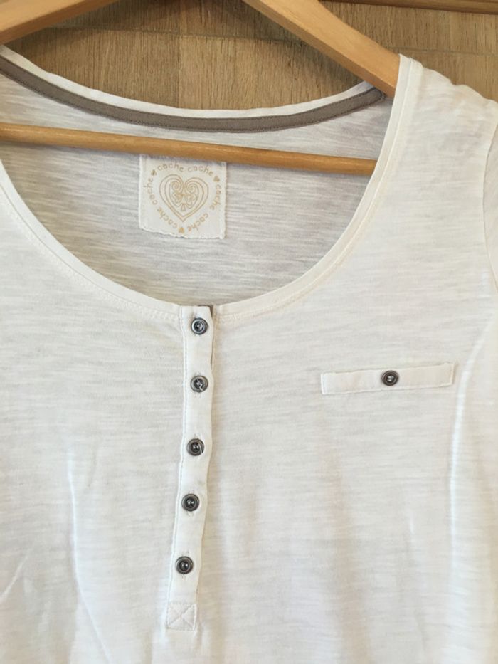 tee-shirt / t-shirt femme Cache cache encolure arrondie ouverture/ fente milieu devant avec boutons poche poitrine avec bouton manches longues coudières tissu marron finitions: ourlets coupe droite bas droit tissu souple avec élasthanne blanc (petites marques/ trous cf photos) agréable à porter