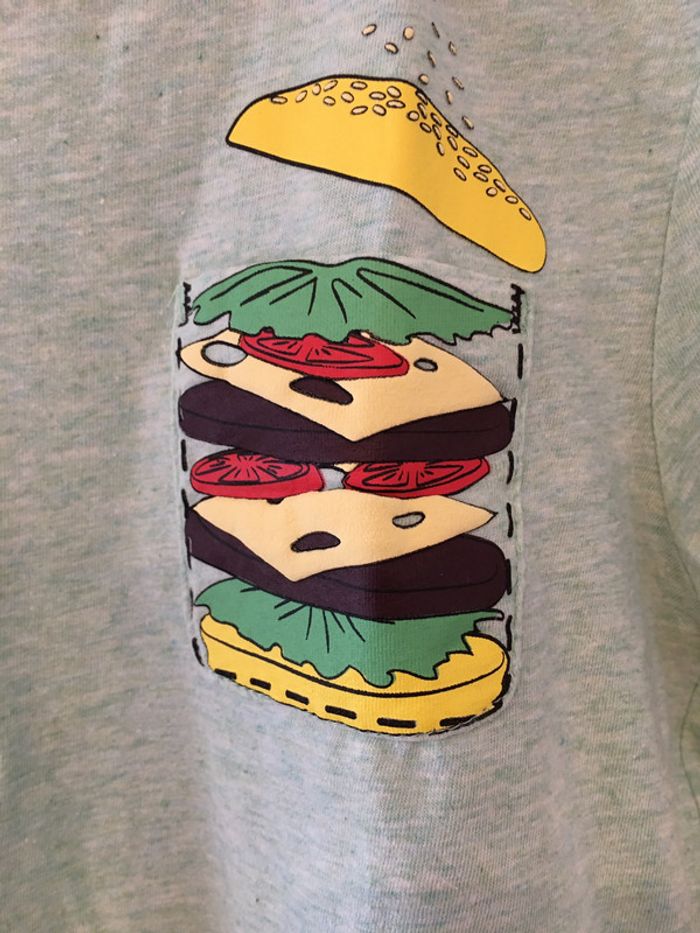 tee shirt enfant garçon t-shirt Kiabi tissu vert chiné visuel burger rouge, marron, jaune, vert, beige souple, avec elastane encolure arrondie manches courtes: bords roulottés poche poitrine coupe droite bas droit