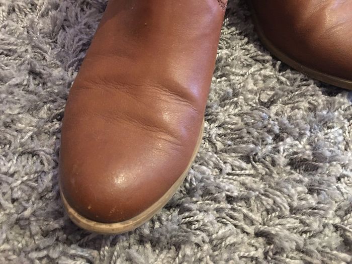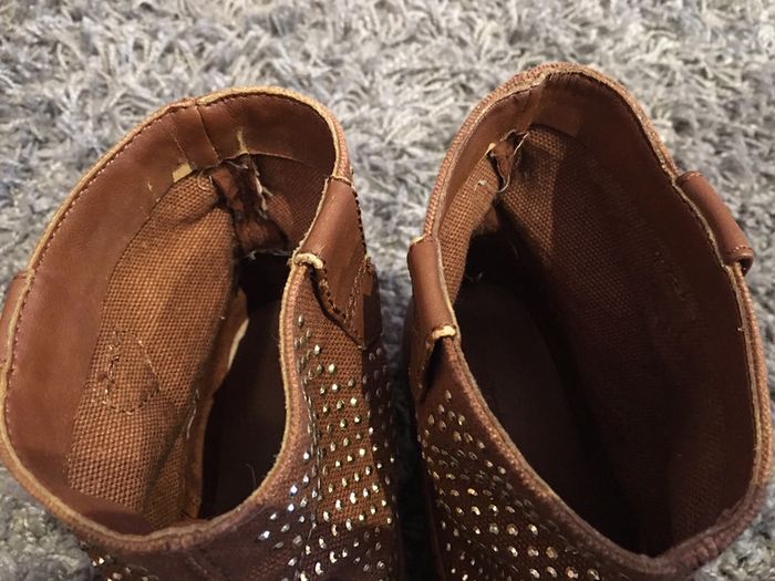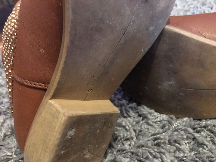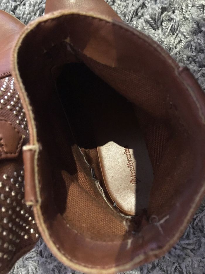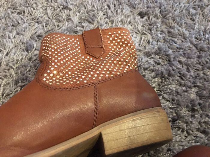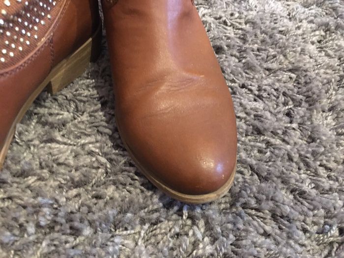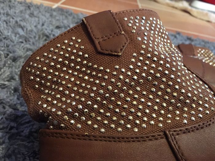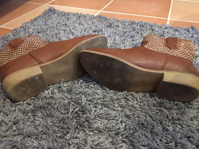 chaussures bottines femme Stradivarius coloris marron simili cuir marron sur cou de pied tissu marron avec clou argentés bouts arrondis montantes aux chevilles boucles sur côtés petits talons coloris marron clair effet bois usure naturelle idem photo Stradivarius