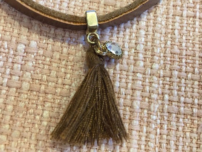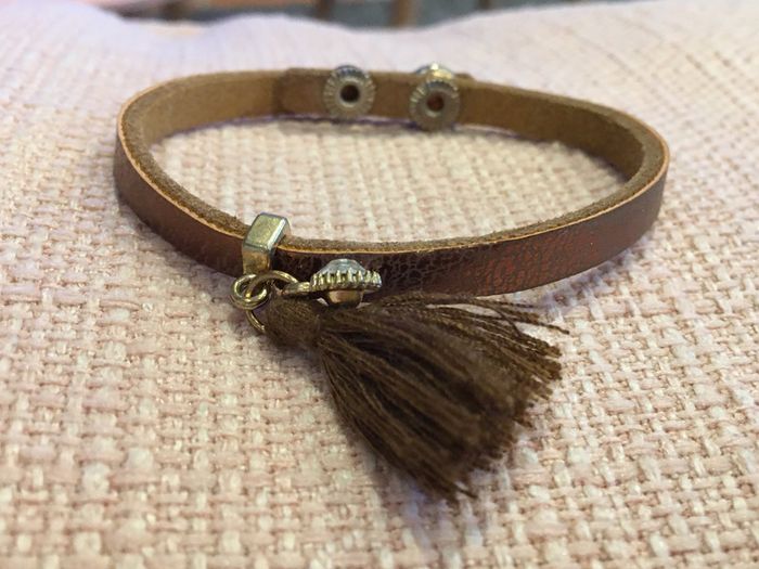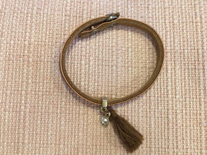 bijou bracelet femme un seul tour de poignet réglable : 2 pressions grises simili cuir marron bijou support doré avec strass blanc pompon marron petit effet patiné sur les parties en métal: naturel, d’origine