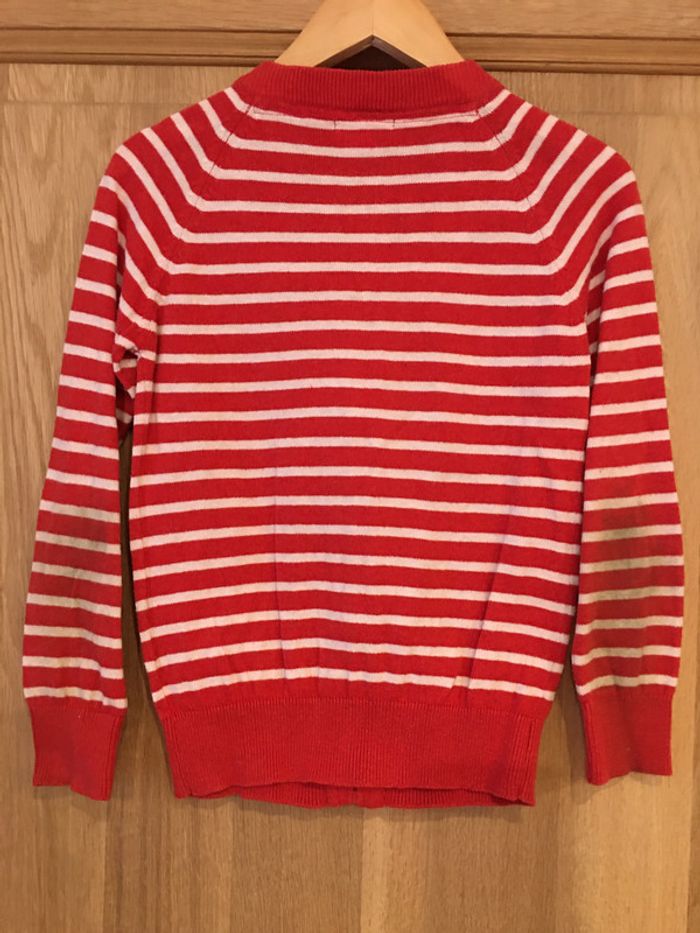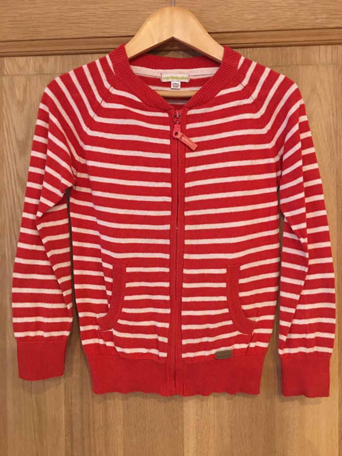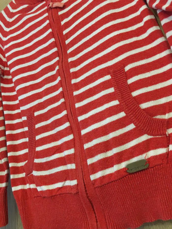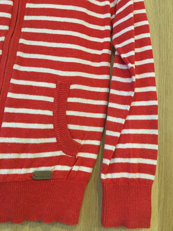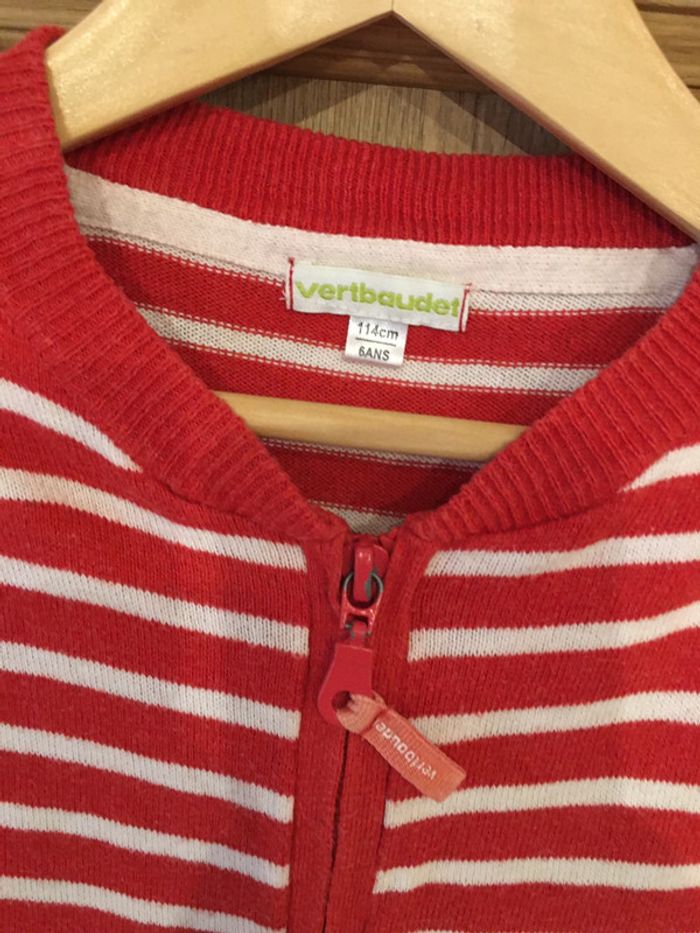 gilet veste en laine enfant garçon verbaudet laine à rayures rouge et blanc souple, doux encolure arrondie col rib manches longues (marques aux coudes idem photo - peut peut être partir avec du détachant) fermeture milieu devant par zip poches devant coupe droite bas droit finitions rib