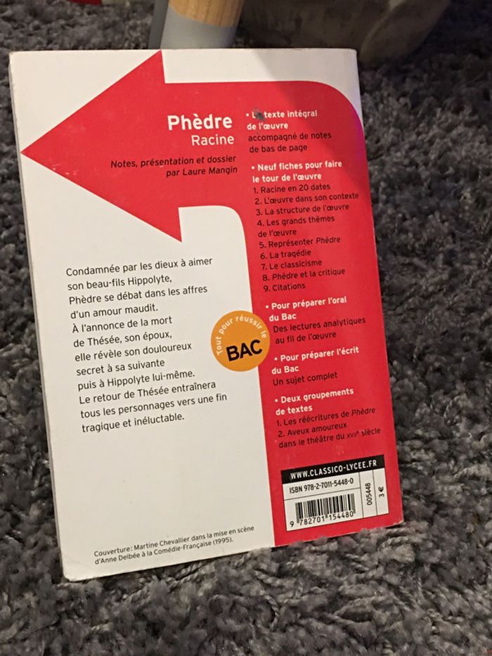 livre de poche Phèdre Racine classico lycée édition Belin Gallimard texte intégral et dossier couverture cornée idem photos pages intérieur en bon état 978-2-7011-5448-0
