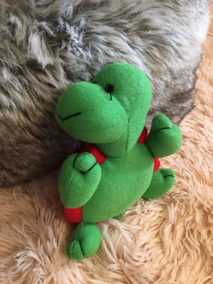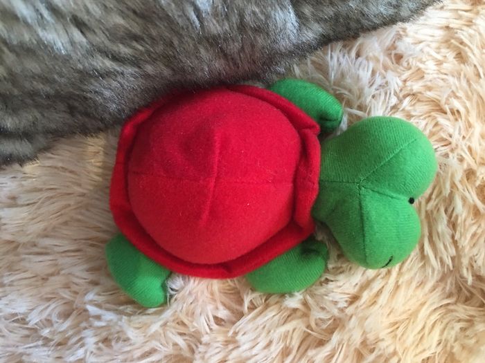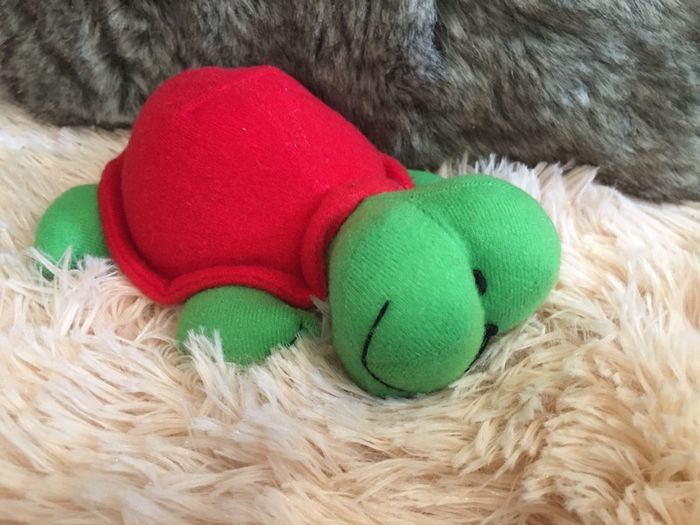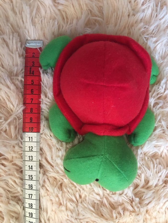 doudou peluche tortue intérieur rembourré ouatine souple tissus colorés carapace rouge corps vert yeux noirs 16 cm
