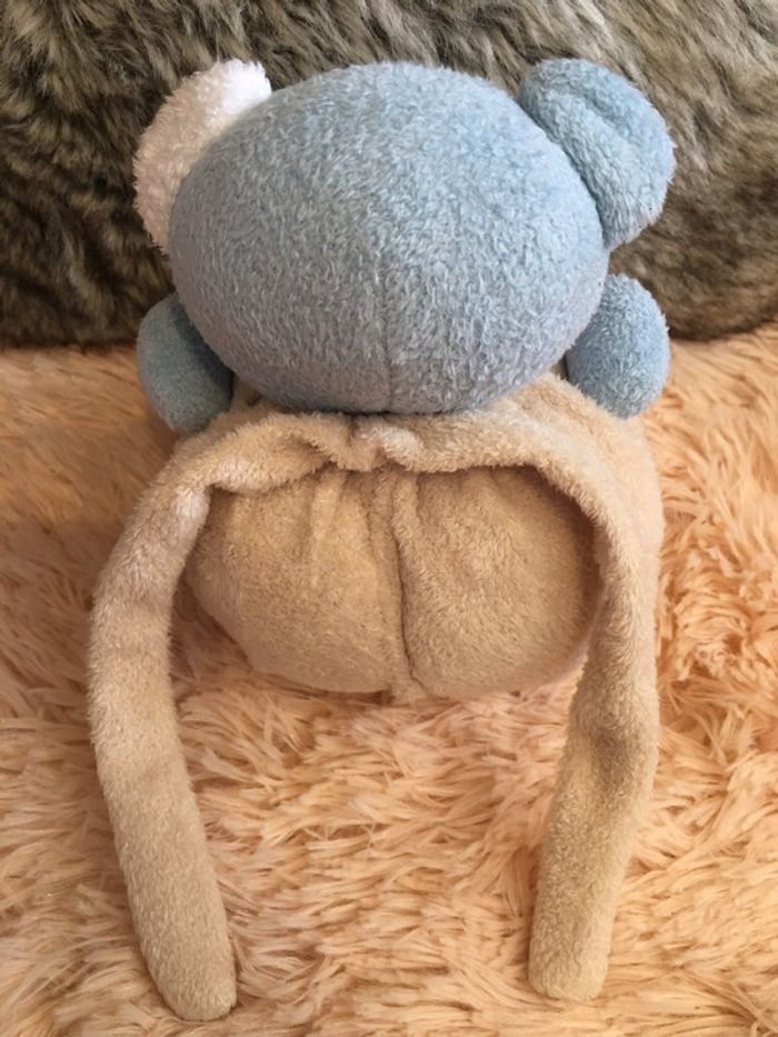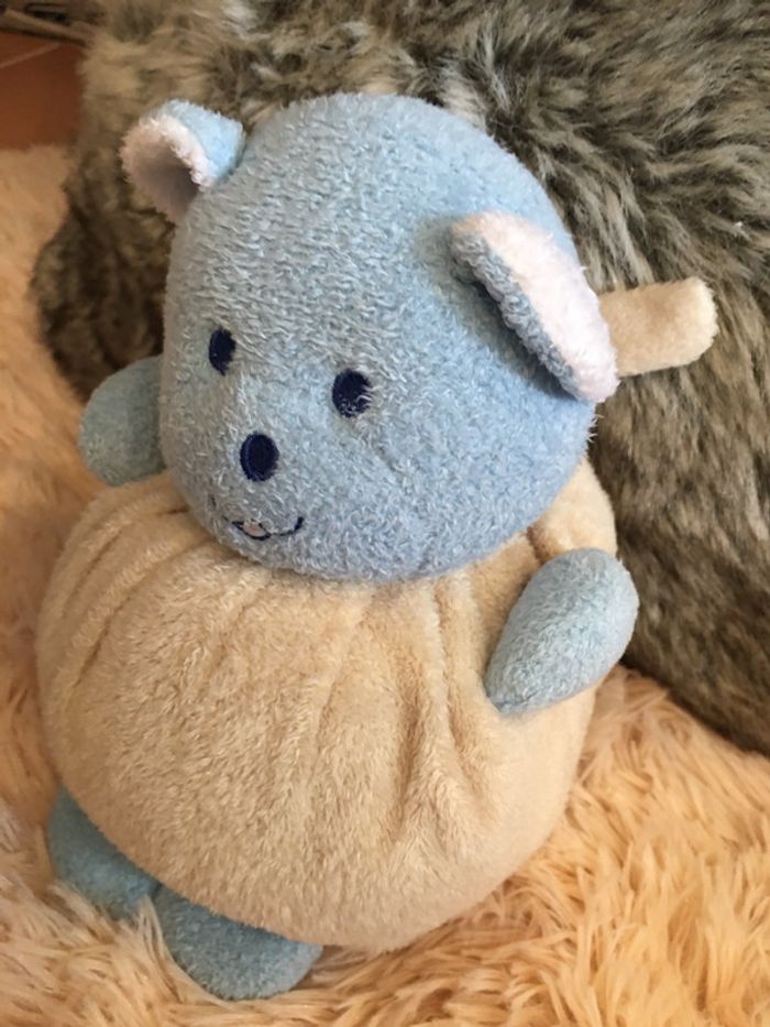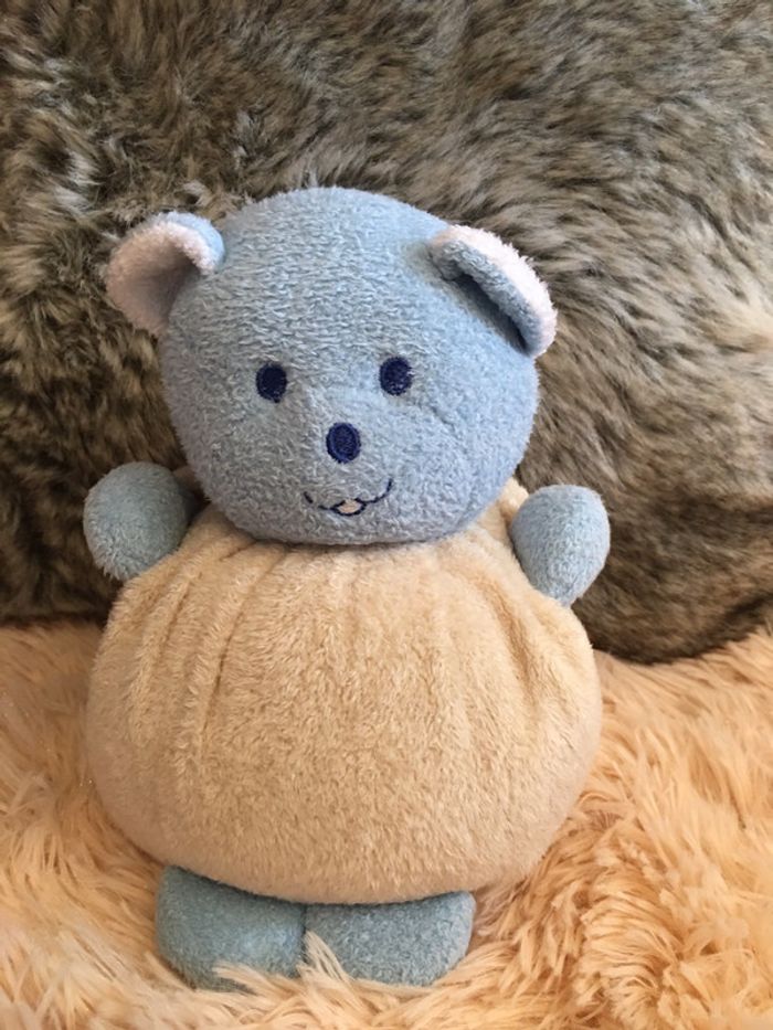 doudou peluche ours Mustela formes enfantines arrondies pattes souples bleues tête bleue nez, yeux, bouchés bleu Marine navy intérieur rembourré tissus doux : ventre beige crème pattes d’attaches au dos: à nouer (pour l’accrocher à la poussette ou autre) hauteur 19 cm