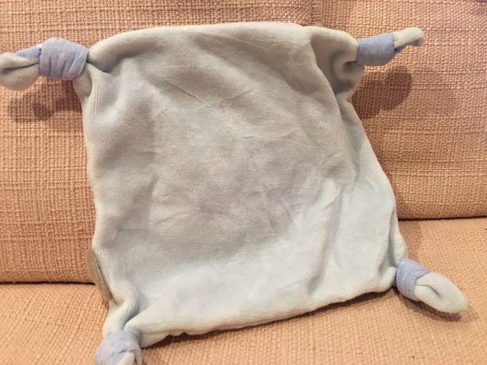 doudou plat carré avec noeuds aux extrémités application ours broderie Kaloo tissu uni doux bleu ciel + tissu flocons blancs souple 19 cm attend de nouveaux câlins