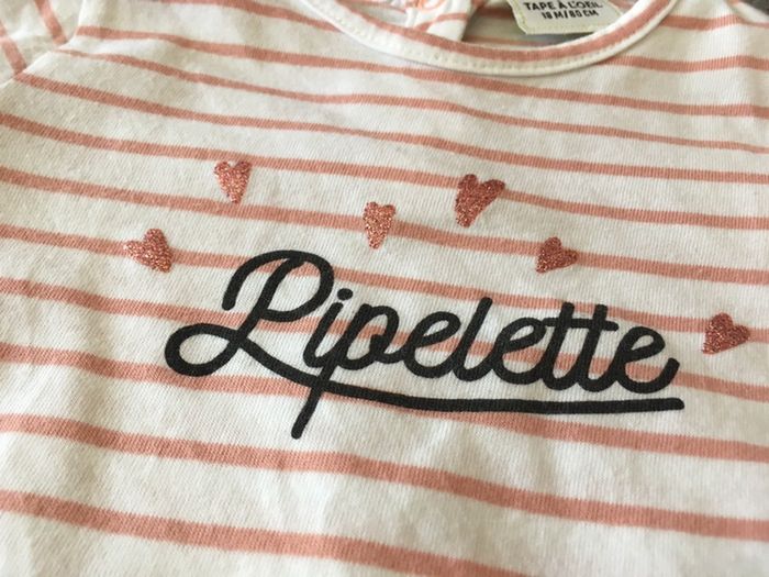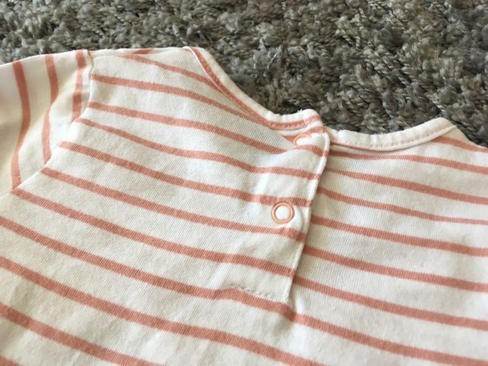 tee-shirt bébé fille manches longues encolure arrondie visuel: sérigraphie + paillettes sur le devant « texte + étoiles » ouverture fermeture au dos par boutons pressions coupe légèrement évasée bas droit tissu souple avec élasthane à rayures finitions: biais
