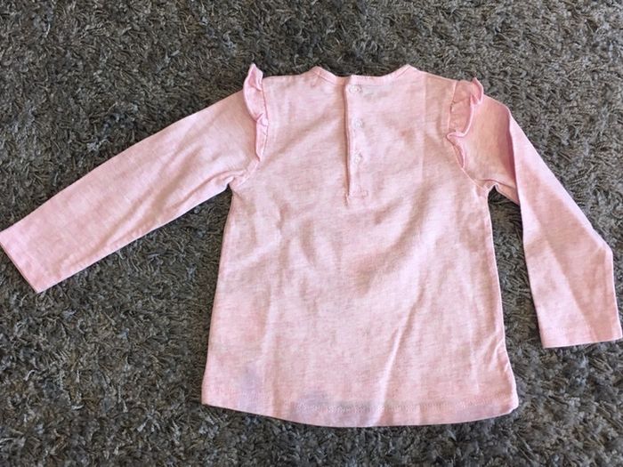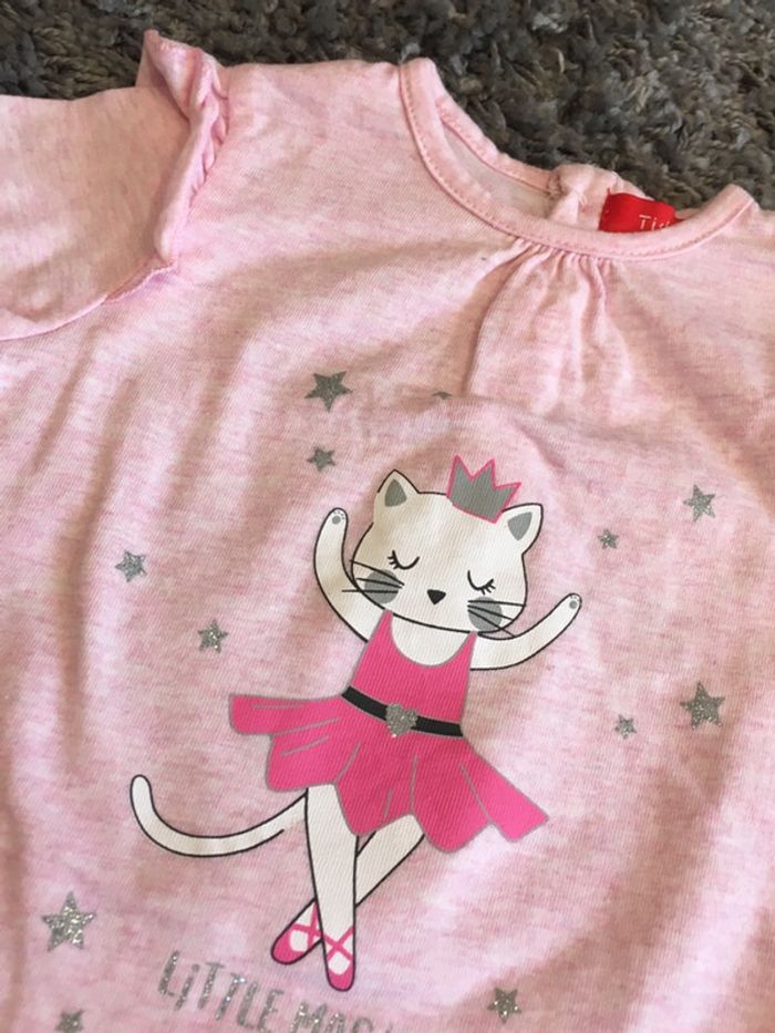 tee-shirt bébé fille manches longues volants fronces aux entournures encolure arrondie fronces milieu devant visuel: sérigraphie + paillettes sur le devant « danseuse petit chat » ouverture fermeture au dos par boutons pailletés coupe évasée bas droit devant et courbe au dos devant plus court que dos