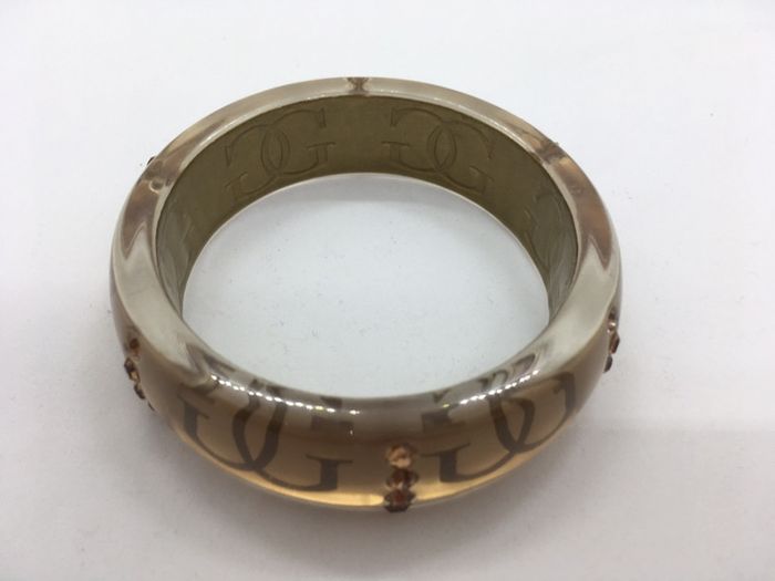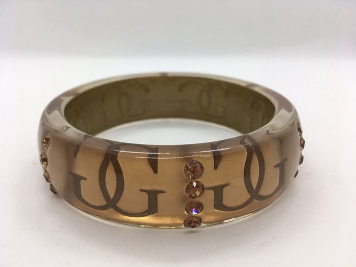 bracelet femme Guess forme ronde pour passage au poignet coloris marron clair transparent lettres intérieur marron foncé strass extérieur marron camel