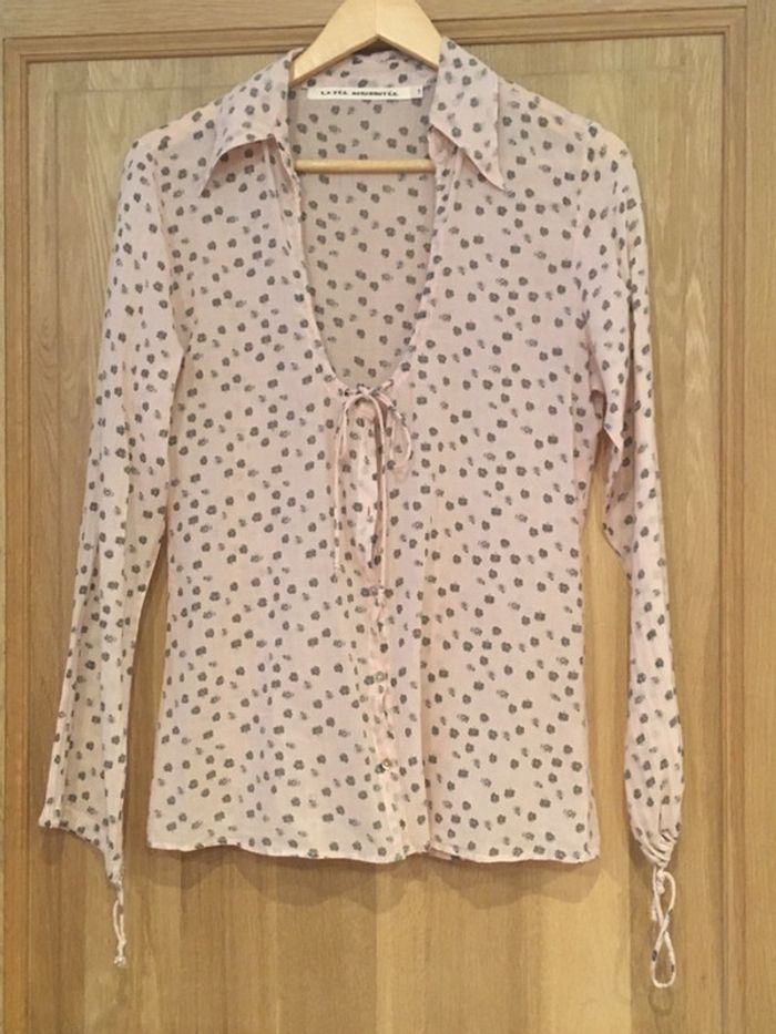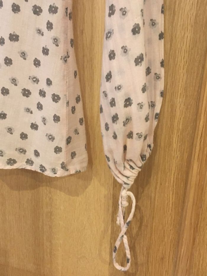chemise manches longues avec fentes + liens pour resserrer col chemisier avec encolure en u en dessous + liens ouverture milieu devant avec boutons (manque deux boutons dans le haut) coupe droite bas droit tissu à motifs fleurs