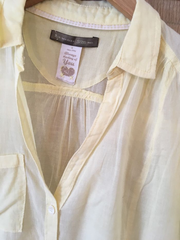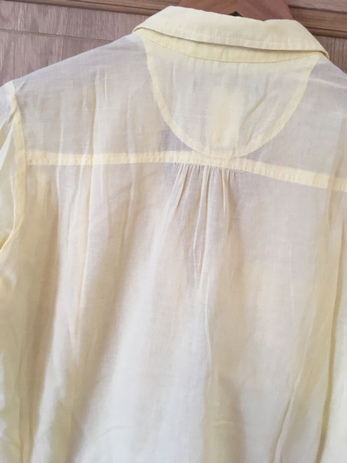 chemise tissu jaune uni manches 3/4 avec fentes + boutons + pattes de boutonnages pour retrousser col chemisier fermeture milieu devant par boutons poche poitrine découpe + pinces surpiquées fronces milieu dos bas dos plus long que bas devant