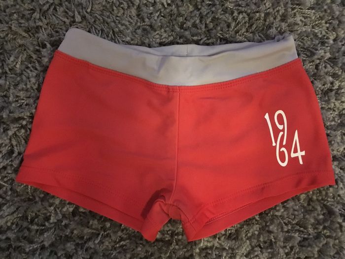 maillot de bain caleçon shorty enfant garçon jambes courtes short tissu élasthane rouge ceinture grise ceinture avec cordon intérieur : réglable visuel print sur le devant