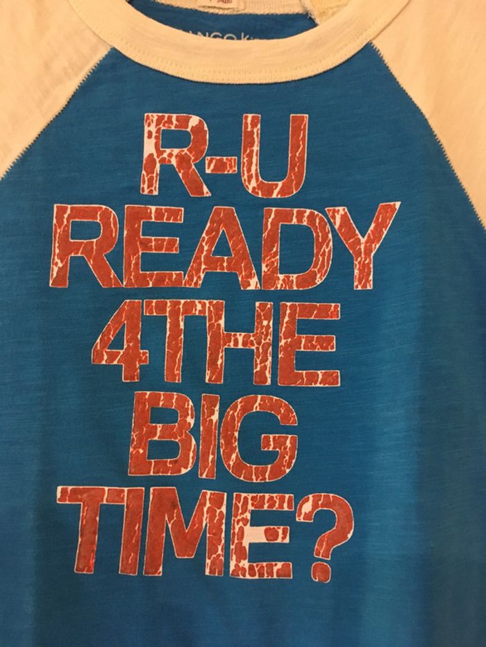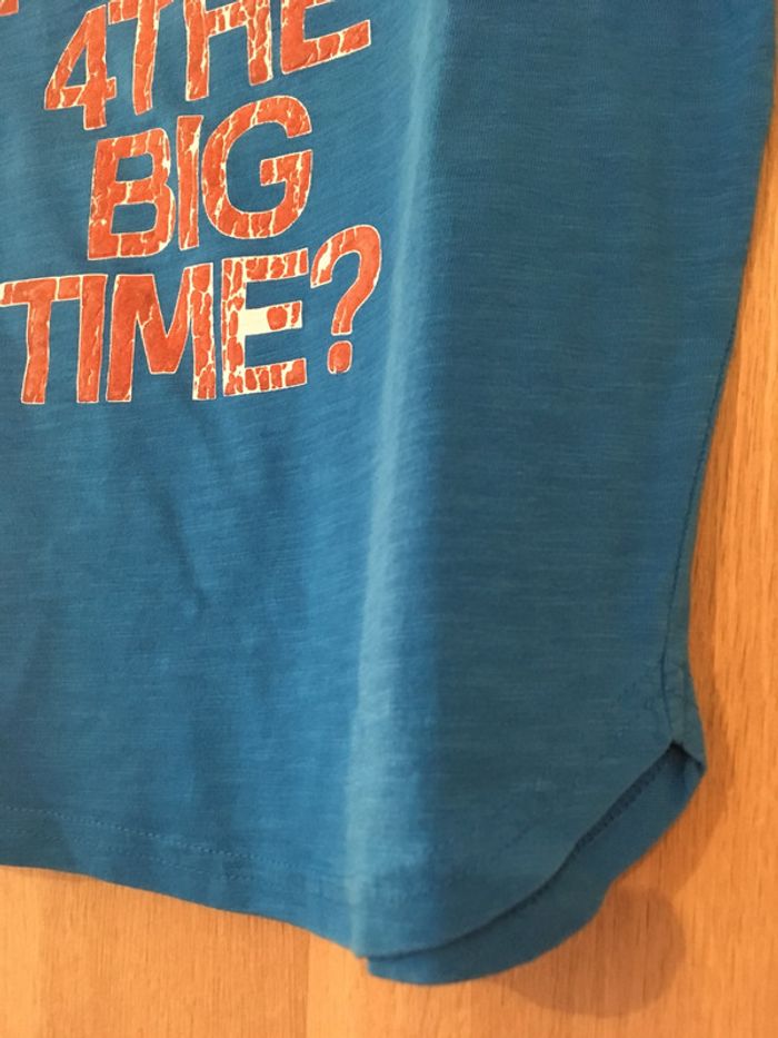 manches courtes beiges corps bleu coupe droite visuel print + flock sur le devant encolure arrondie bas cotes courbes