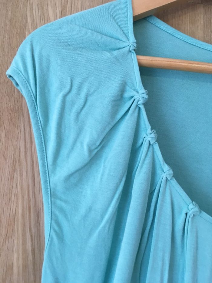 manches courtes encolure arrondie fantaisies sur le devant uni au dos bas devant courbe (plus long que dos) bas dos droit coloris vert mint évasé