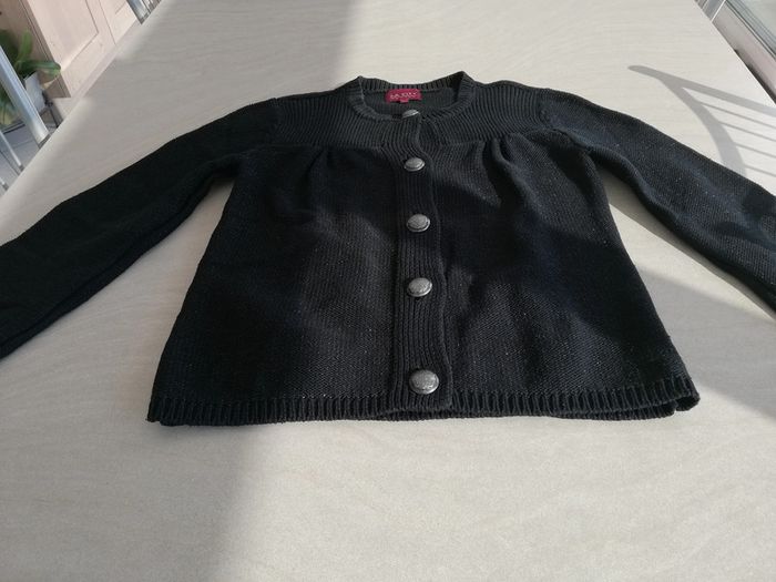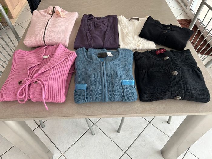 7 gilets à manches longues : 1 gilet fin neuf écru Tex de taille S 1 gilet fin violine La Redoute de taille 38/40 1 gilet fin gris Yessica de taille S 1 gilet noir épais La City de taille 2 1 gilet court noir Spilan taille 1 1 gilet Neuf Bon prix de taille 38/40 1 gilet rose Louiana de taille M/L 3€ pièce ou 5€ les deux
