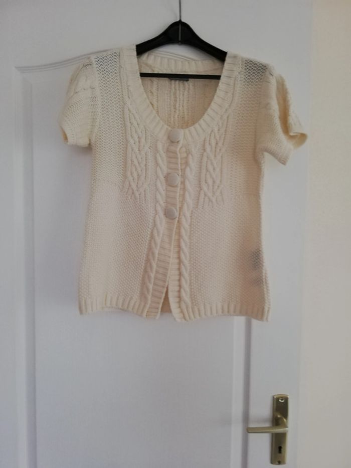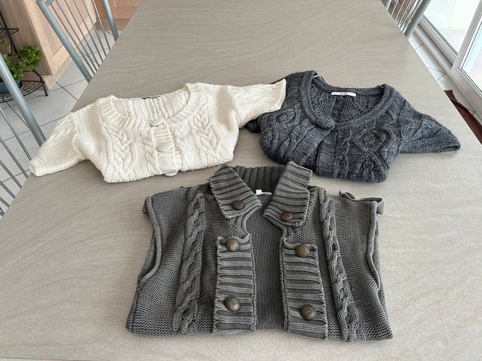 3 gilets dont deux avec manches courtes ( un écru et un gris) et un sans manche de taille S en très bon état 3€ pièce ou 5€ les deux