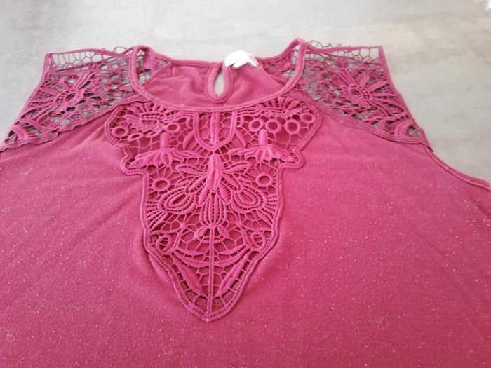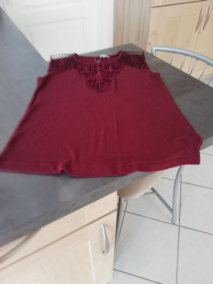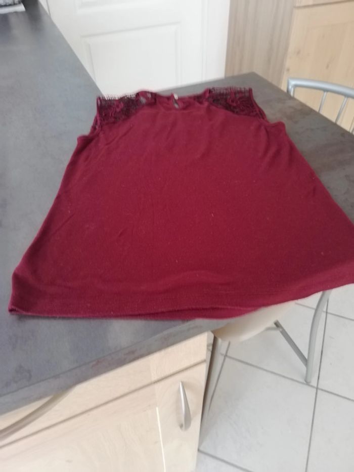 Un tee-shirt sans manche Etam de couleur bordeaux et de taille M , dentelle sur le haut du tee-shirt