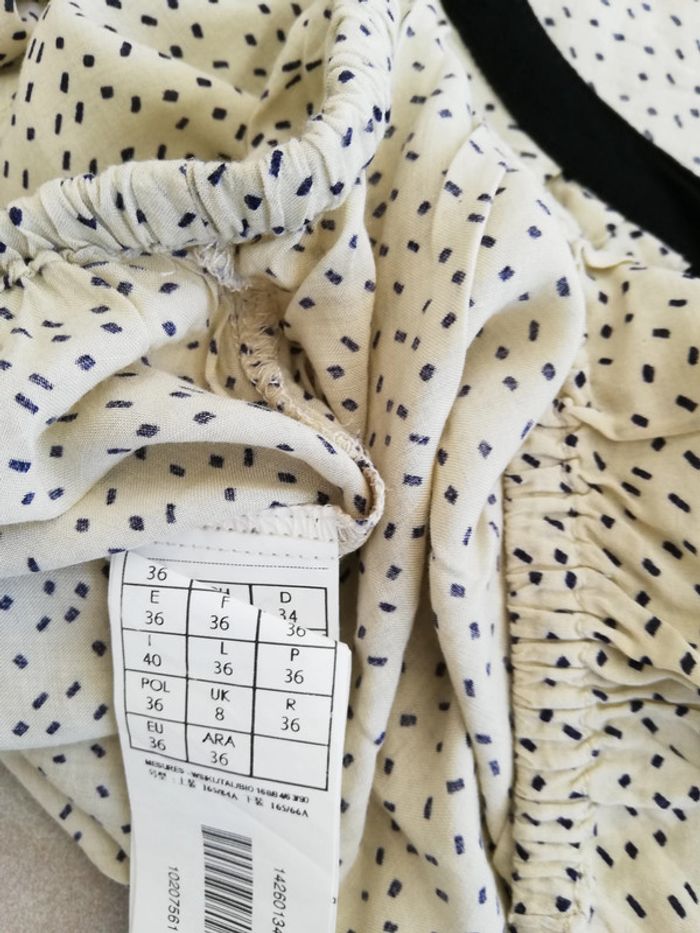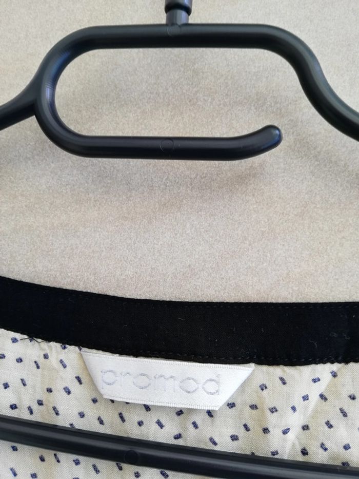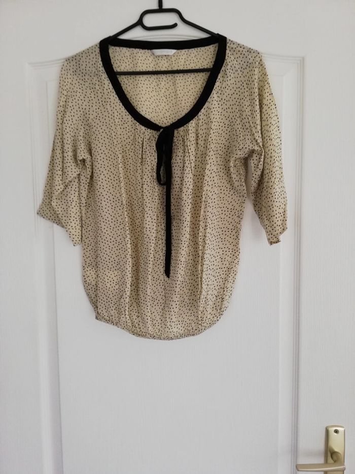 Une blouse beige et noire de marque Promod et de taille 36 avec un nœud noir au col, manches courtes, élastiquée à la base