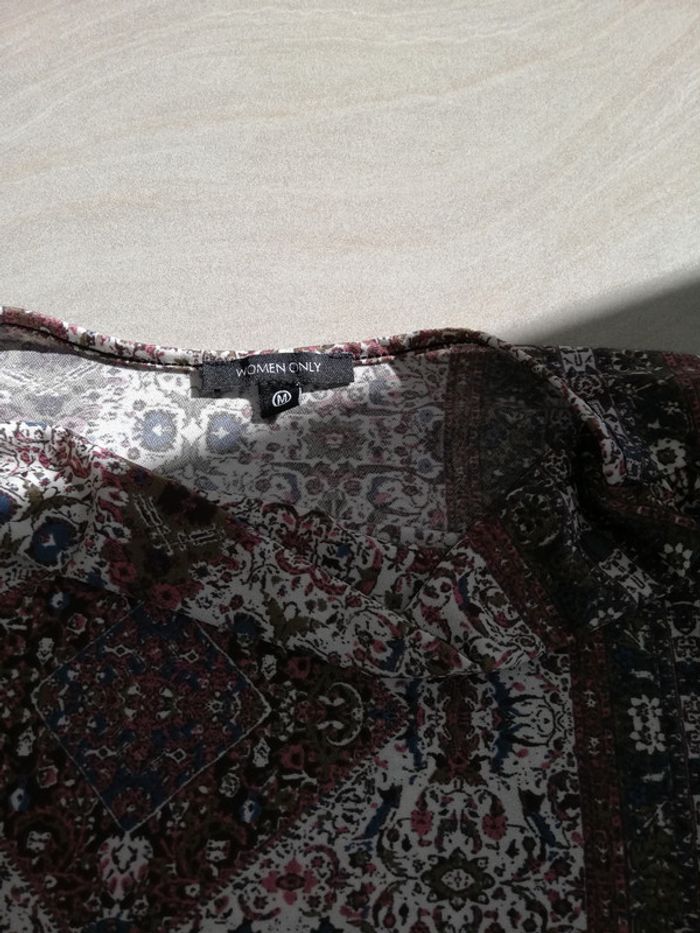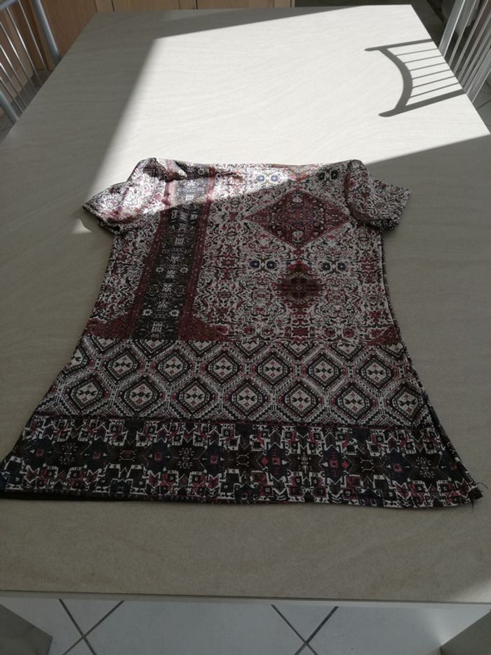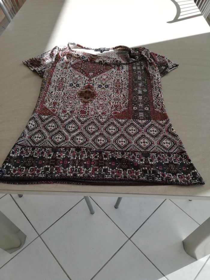 Un haut fantaisie dans les camaieus de marron avec un col bénitier taille M 95% polyester