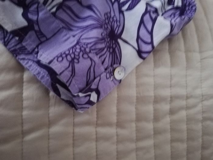 Une blouse en coton lilas manches courtes de taille 38 en excellent état qui se marie très bien avec le pantacourt vendu aussi sur vinted. Avec le pantacourt un prix pour le lot