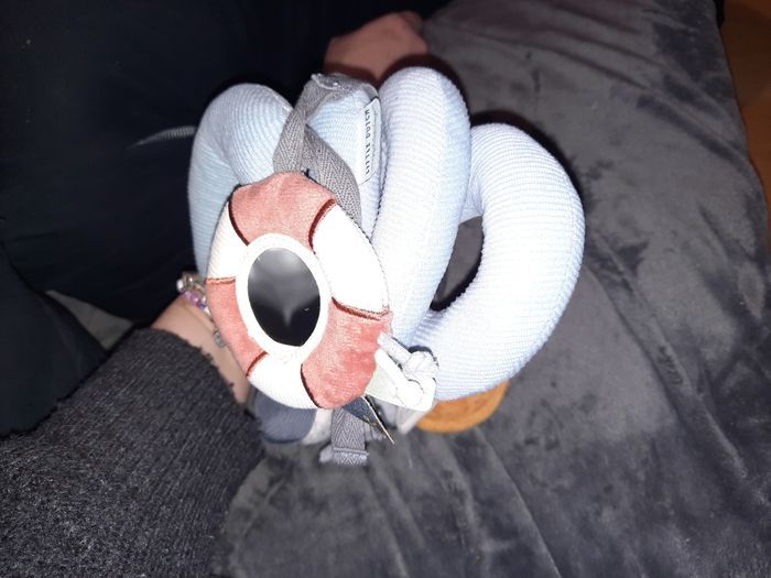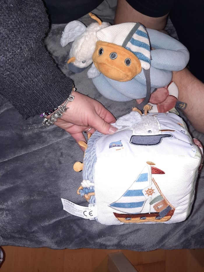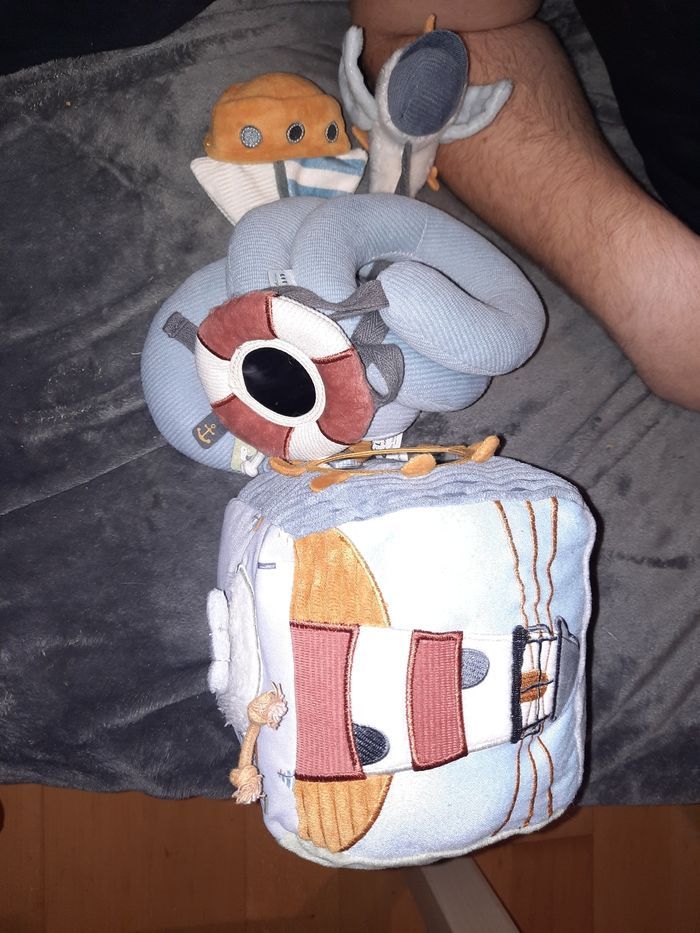 spirale et cube sur le thème marin le cube nous l'avons jamais utilisé, la spirale juste mis que 2 fois sur la poignée du cosy ...