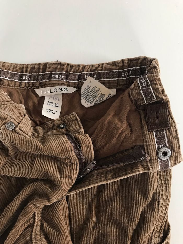 Pantalon bébé large velours marron clair 100% coton, doublure tissu 100% coton. taille ajustable et ouverture par bouton pression et fermeture éclaire. Marque H&M. 6 mois