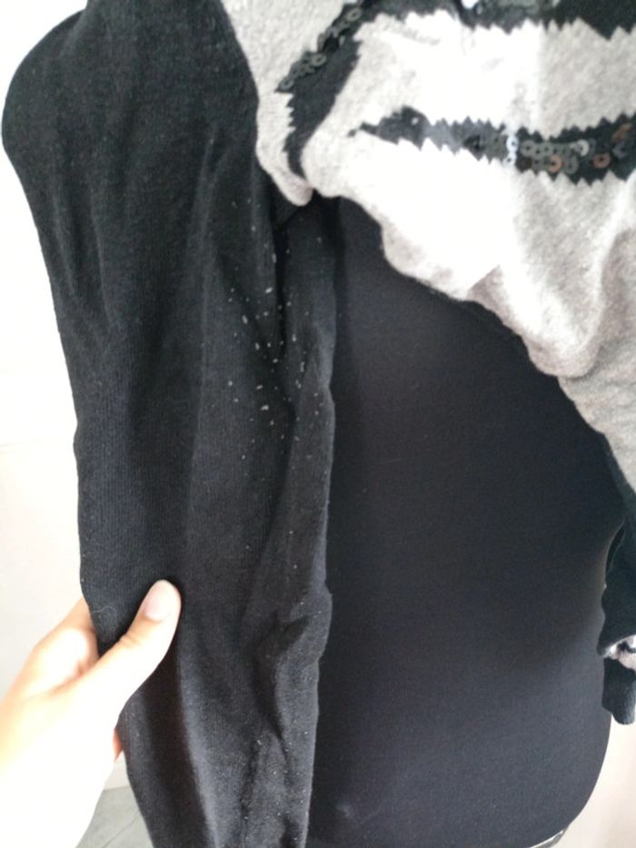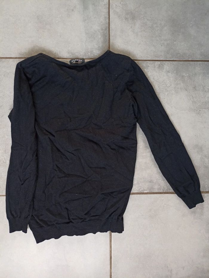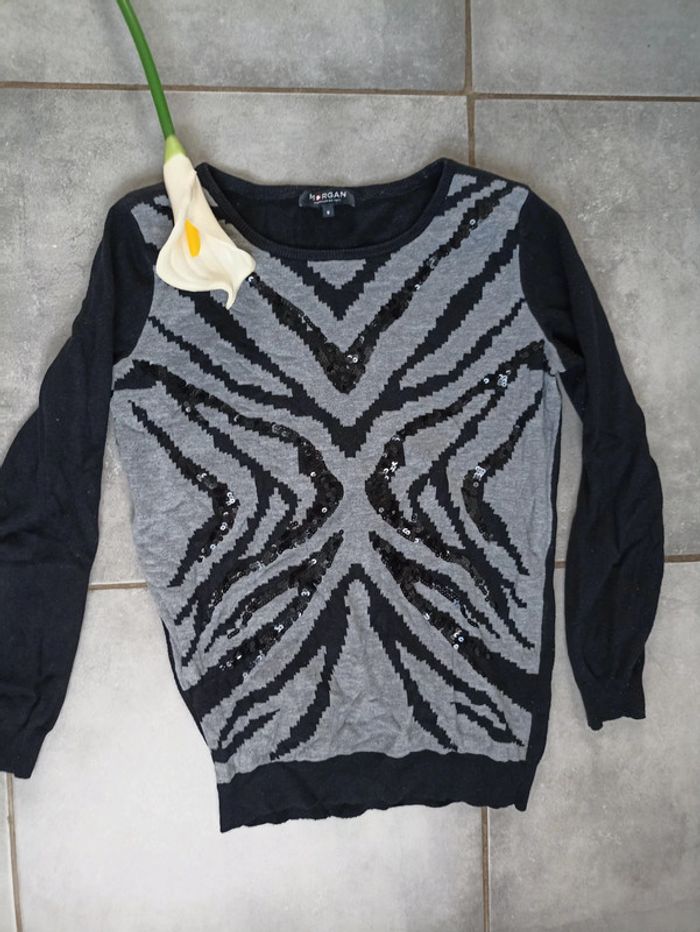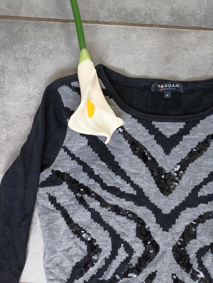 👕pull noir et gris avec sequins .marque Morgan taille S. Bouloches , beaucoup sous les bras, devrait partir avec les petites machines prévue pour. Petites épaulettes 🚚Je dépose les colis le lundi et jeudi 🎁 Petit cadeau dès 5 articles