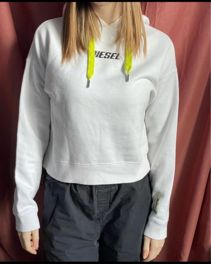 Sweat à capuche Diesel crop top, taille XS Présente des défauts, plus visible sur photo qu’en réel. Tous présents sur les images. Bien prendre en compte les dimensions mise en description🤍 Pour plus de renseignements, de photos, n’hésitez pas à me contactez🤍 l:54cm L:48cm