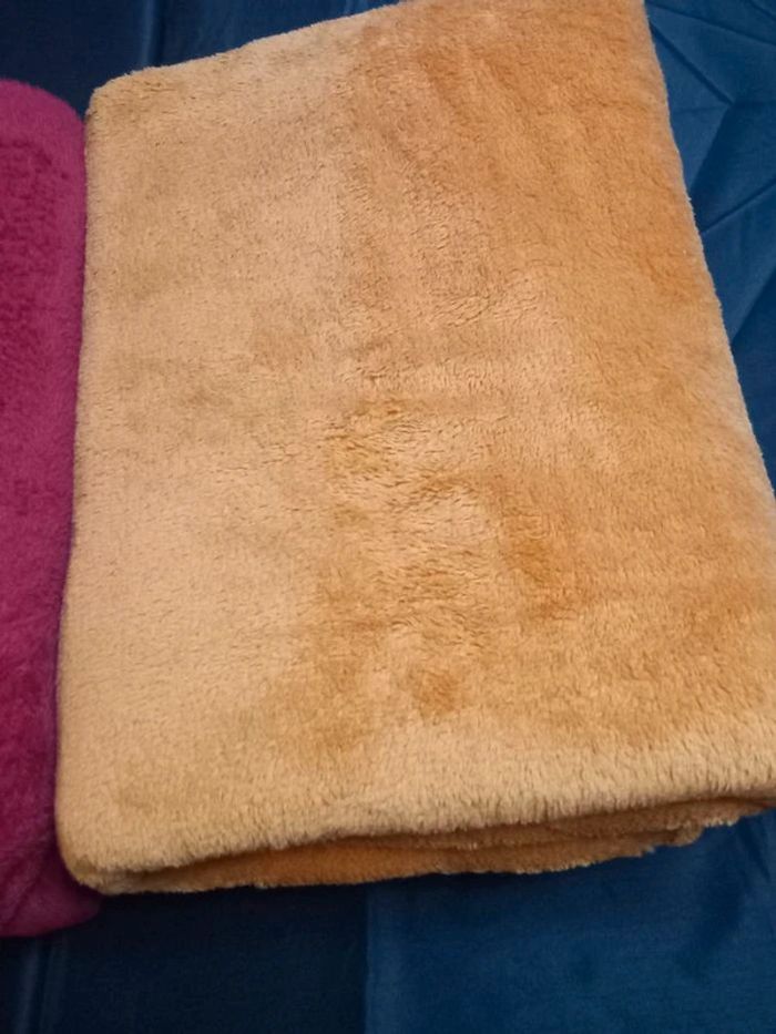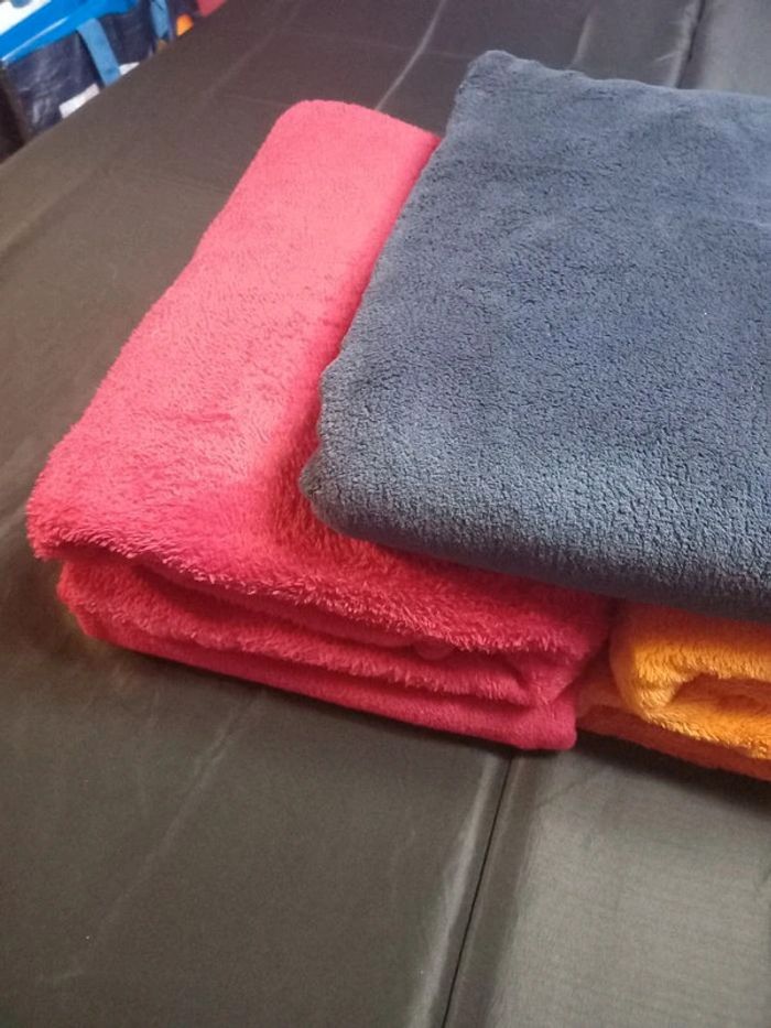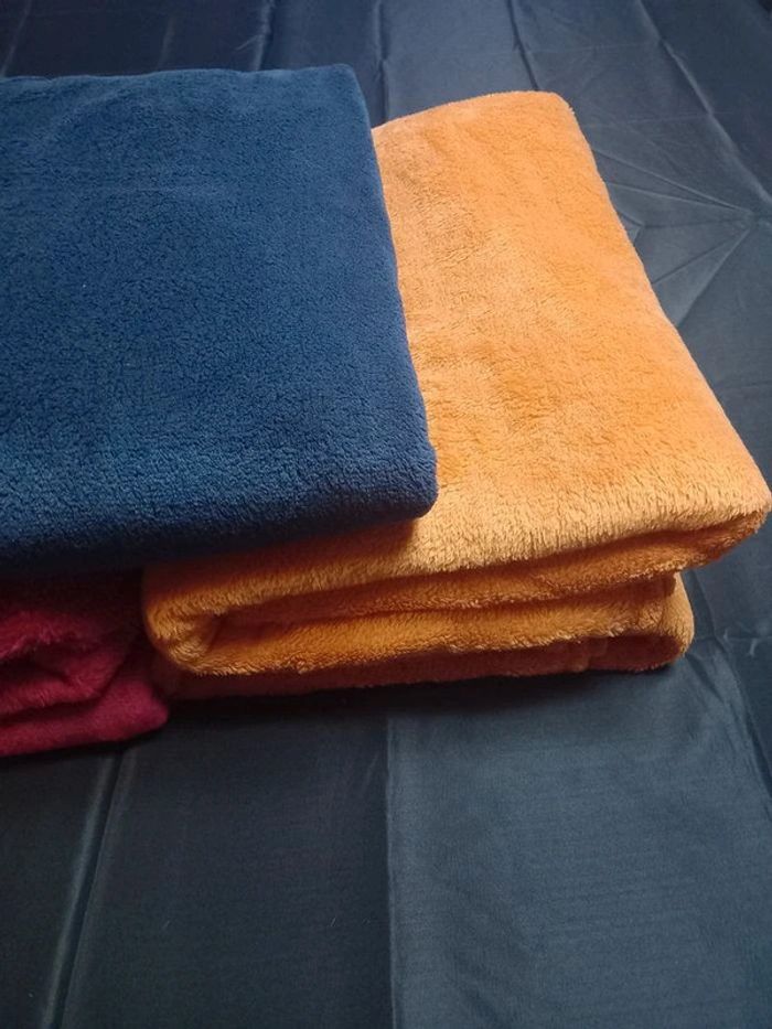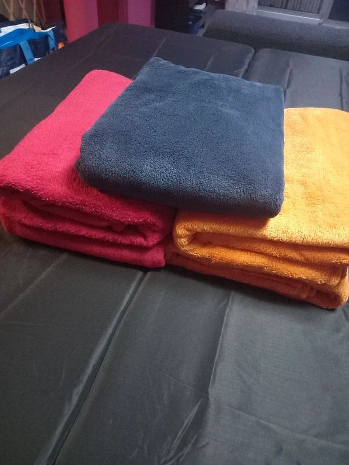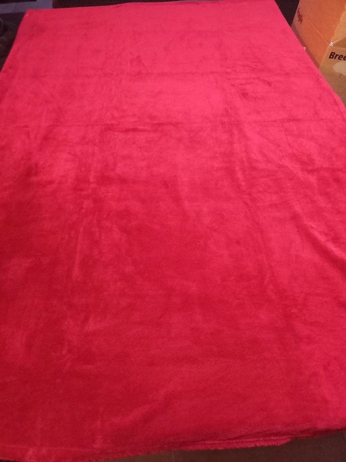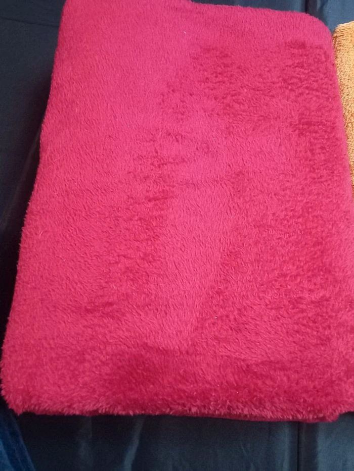Très peu utilisée, très bon état, pas de trous, ni de décousures 126 cm sur 180 cm 9 € pour une couverture 2 rouge, 2 orange et 1 bleu