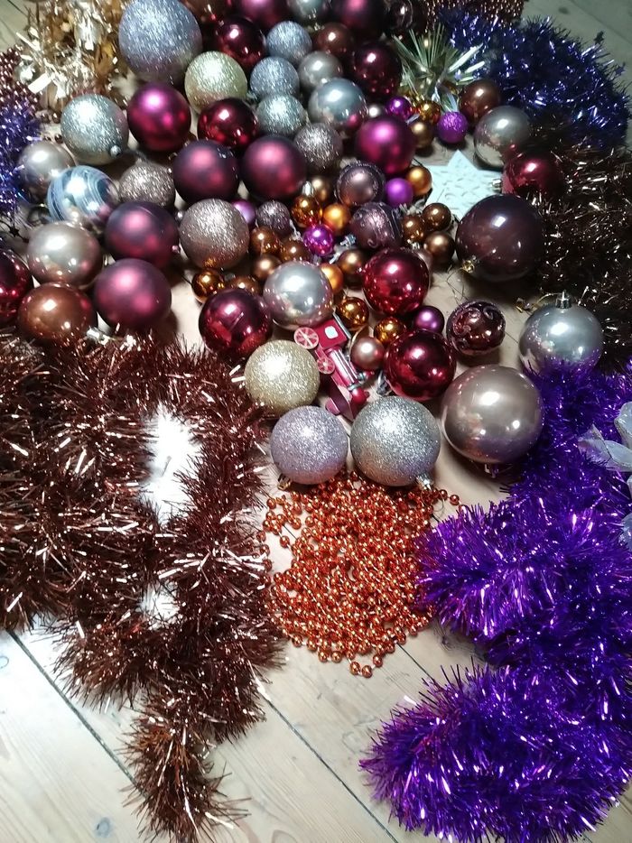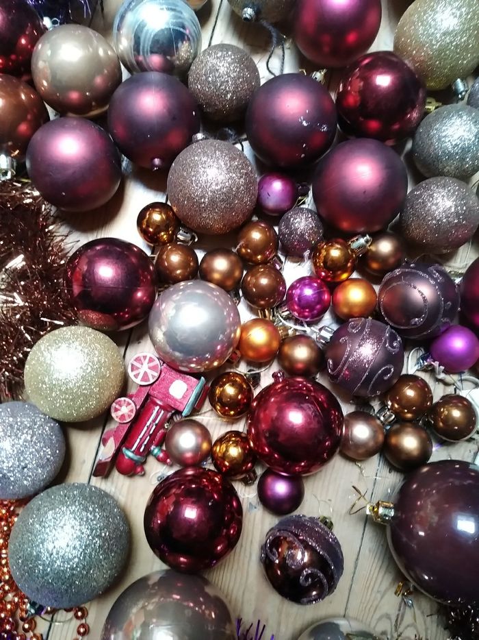 Lot guirlandes et Boules tons marron cuivre violet prune rouge bordeaux beige rose poudré