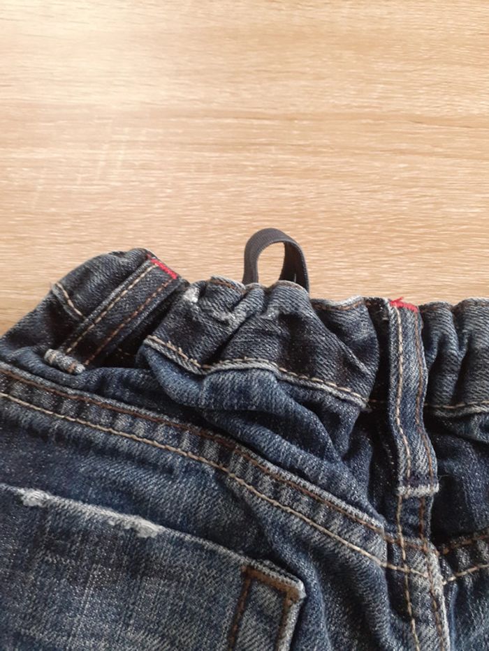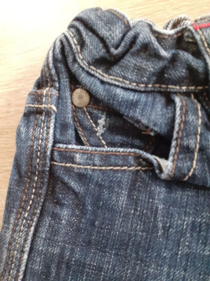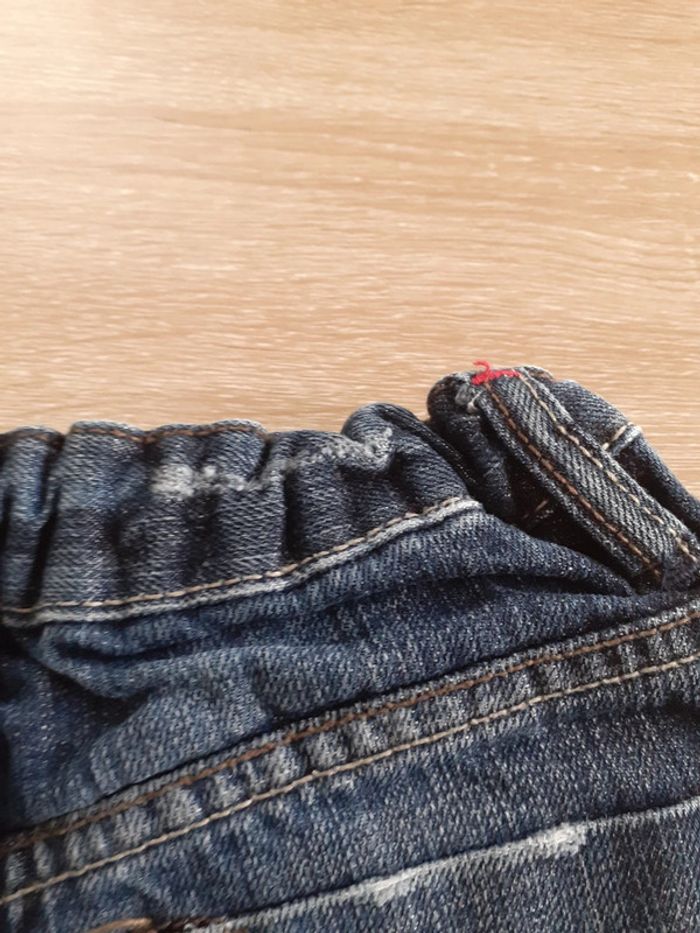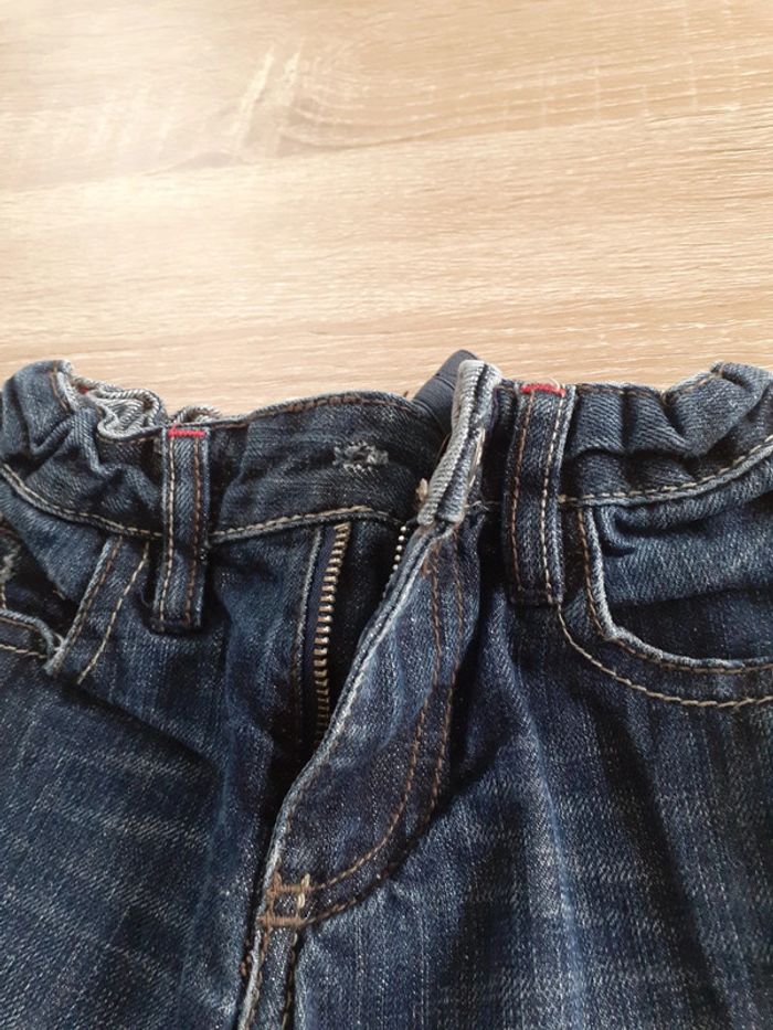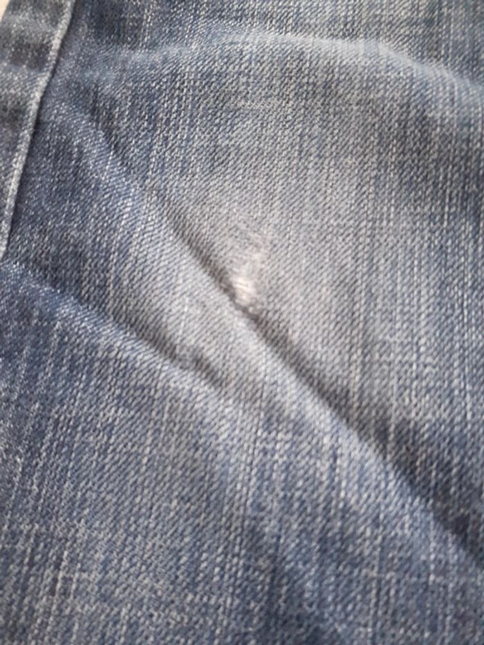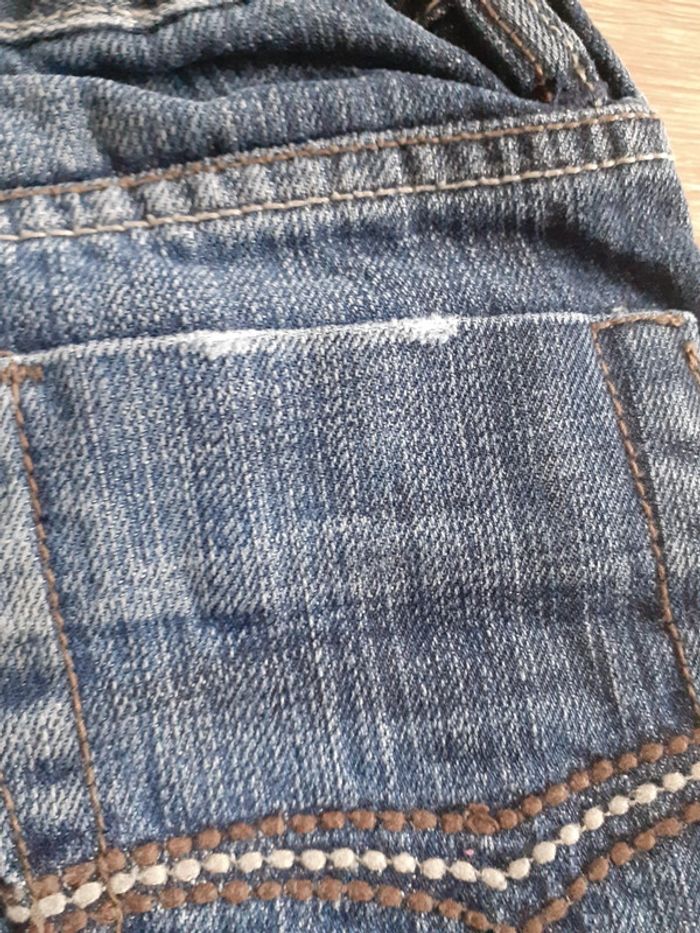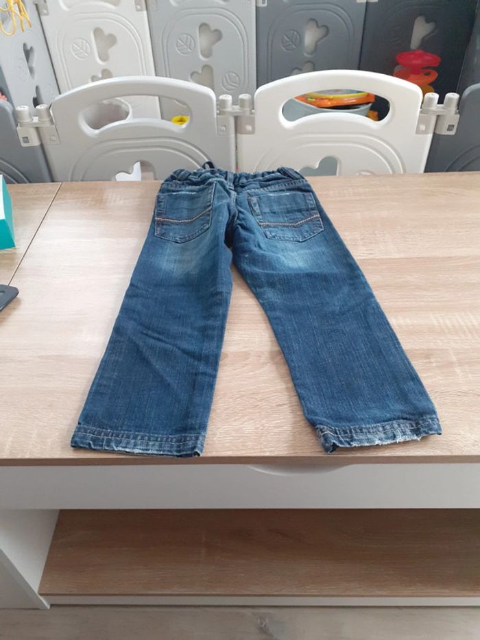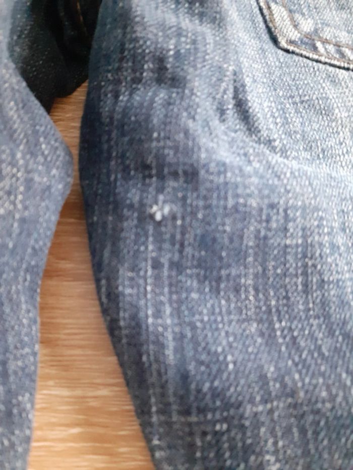 Jean taille 3/4 ans, présente des traces d'usures mais reste en bon état général. Manque la pression au niveau du bouton