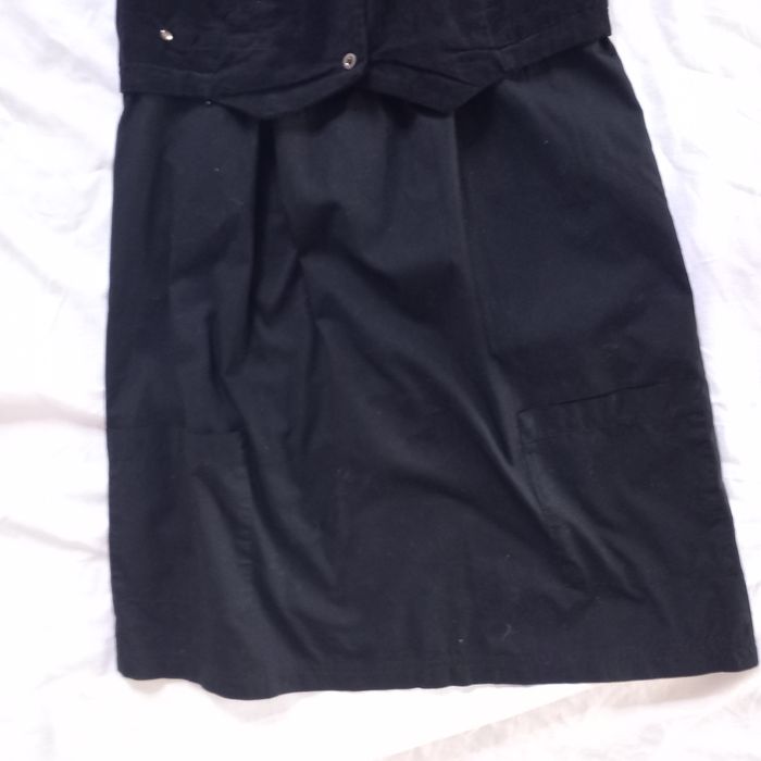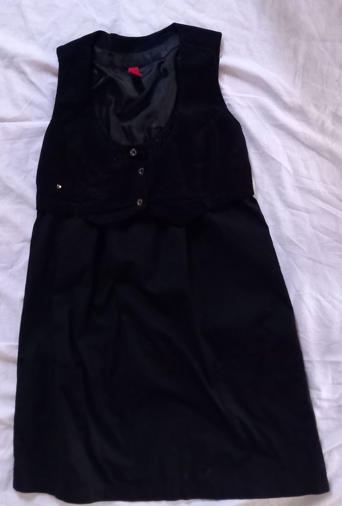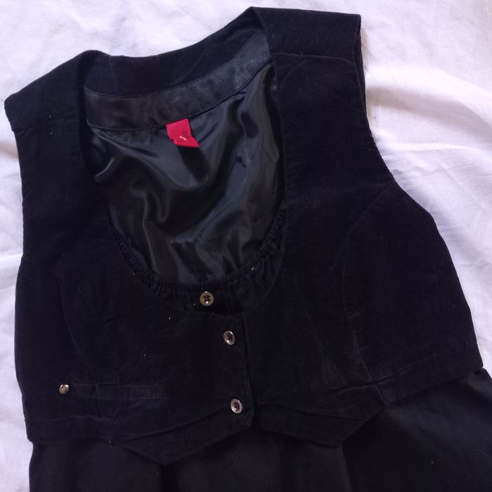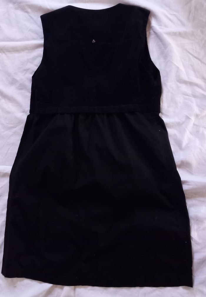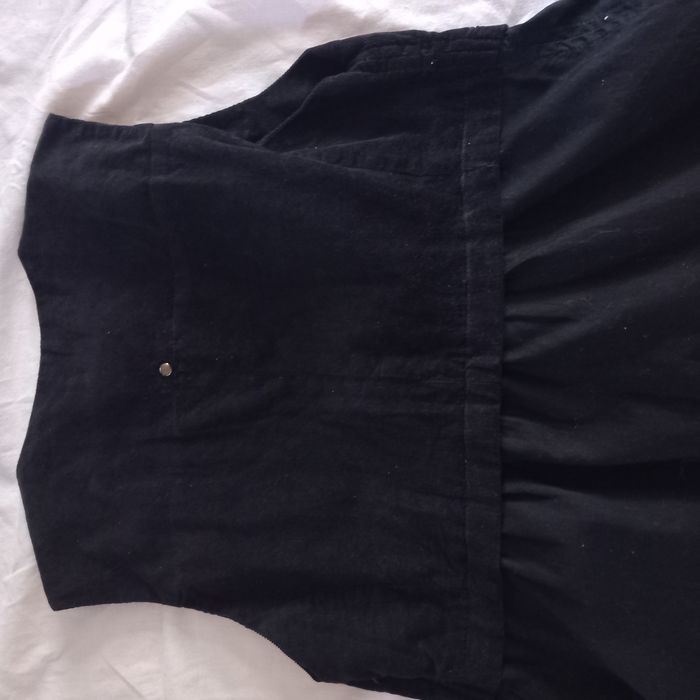 Sans Manches, col rond avec boutons, zip sur le côté, coloris noir, joli effet boléro en velours, marque Vera Moda dénim style crown short dress, 1 bouton supplémentaire, 2 poches Composition 100% coton doublure 100% polyester largeur épaules 35 cm, aisselles 46 cm, Longueur aisselles-bas 62 cm Possibilité d offre en lots. Envoi rapide et soigné
